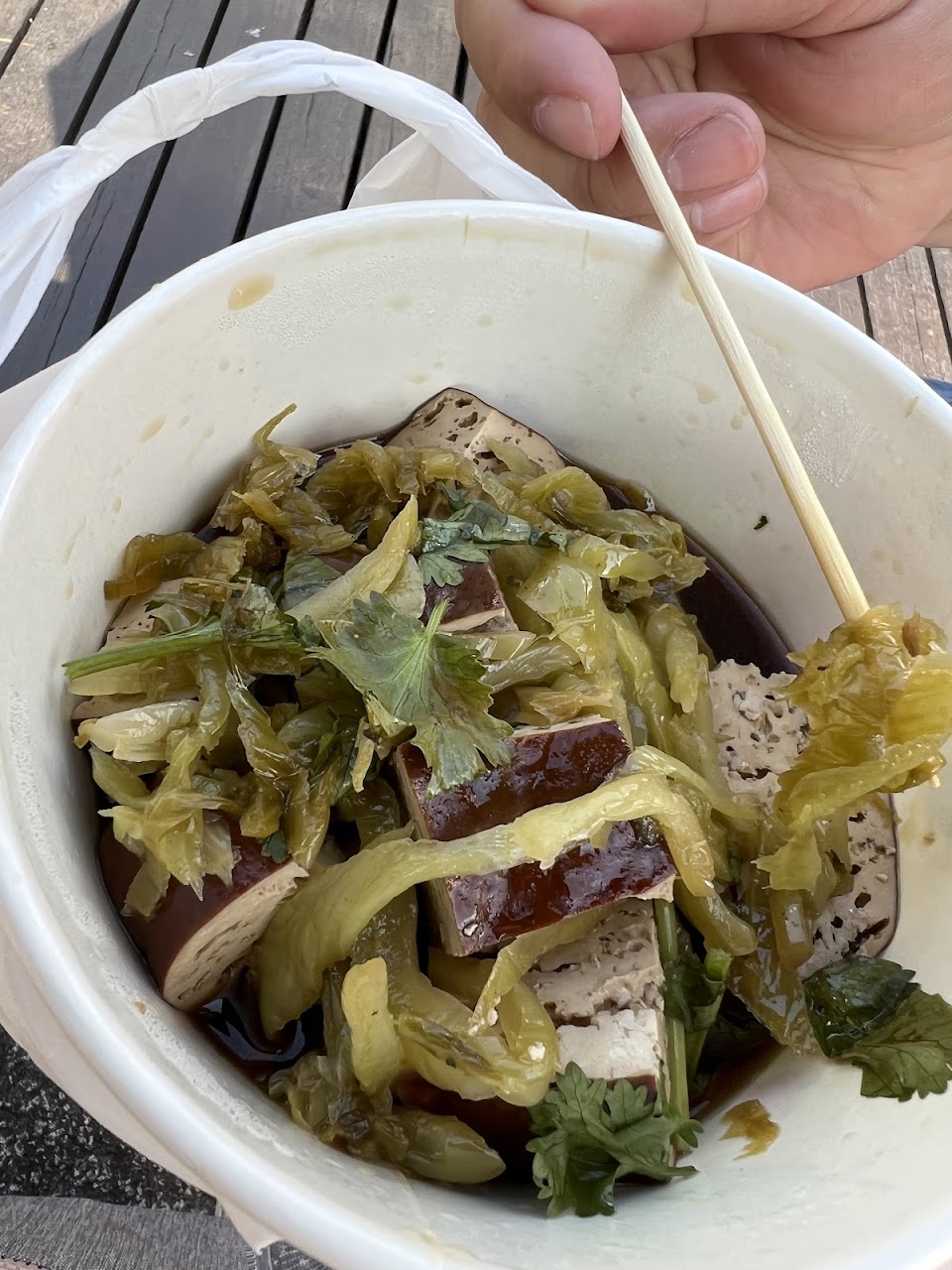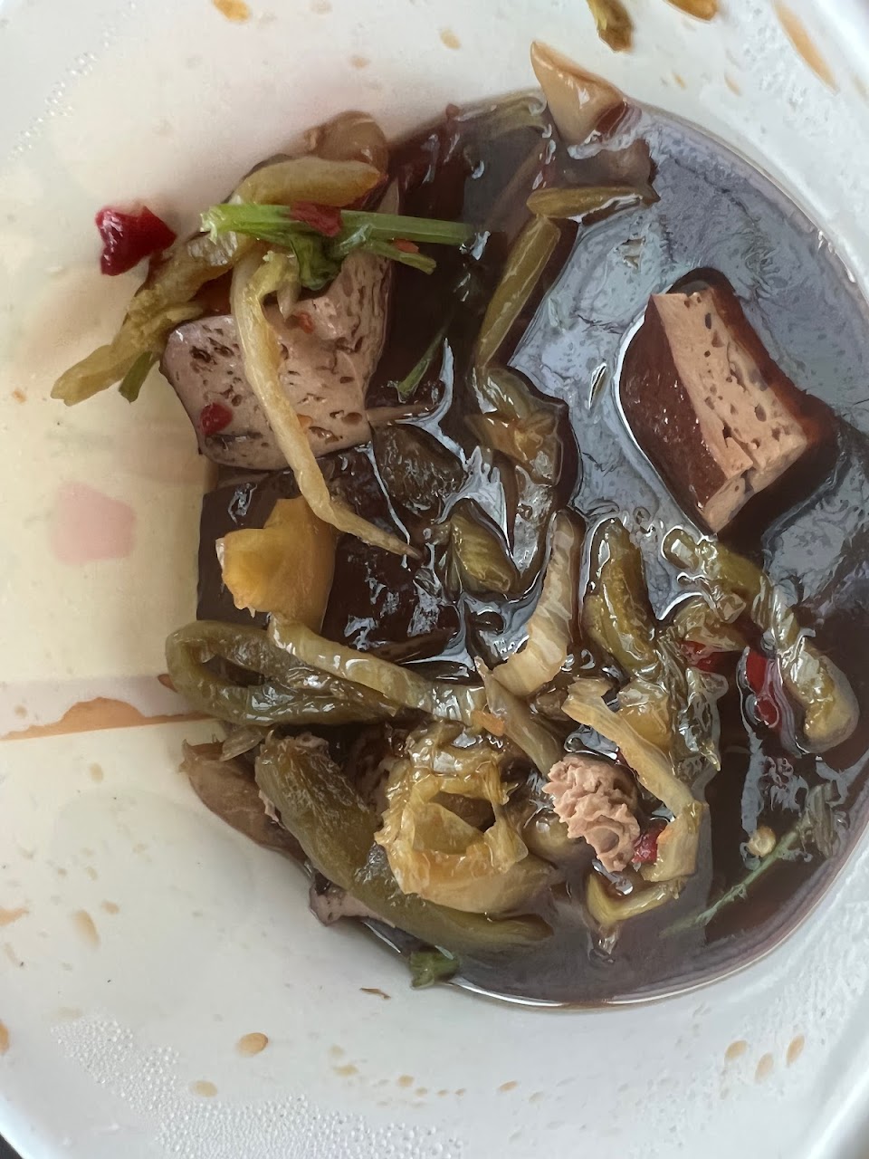 因為很不好吃,吃了一兩口就先放著,結果我發現放久一點後,那個豆乾泡在醬汁裡才有味道,因為那個醬汁無敵鹹