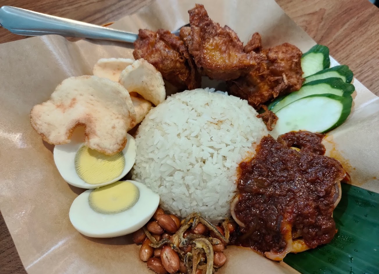 椰漿飯配炸雞,怕辣的人可以請他醬另外裝,突然想要換一下時,又可以沾一下也不用怕太辣。配菜有花生小魚乾、黃瓜片、水煮蛋跟蝦餅,清爽不油膩,配炸雞吃剛剛好。