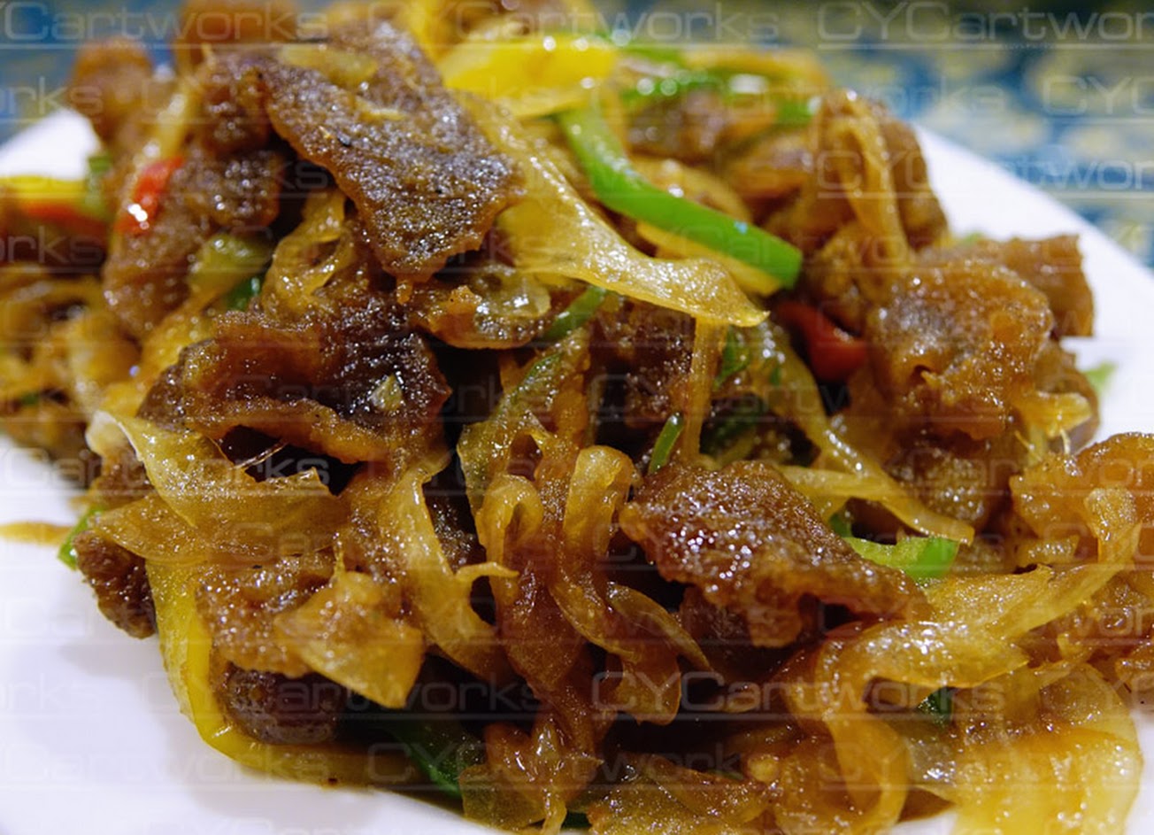 菜單上有些顯然是印度食物,像囊餅、酥餅、香料炒飯、各種咖哩,但也有些是受中國影響的菜色,比如:饃饃很類似中國水餃,而炒麵、炒蔬菜也是。我推薦的一道料理「藏式乾炒」,是以香料醃漬的肉片拌炒洋蔥和辣椒,屬於重口味,配飯或囊餅吃非常適合。