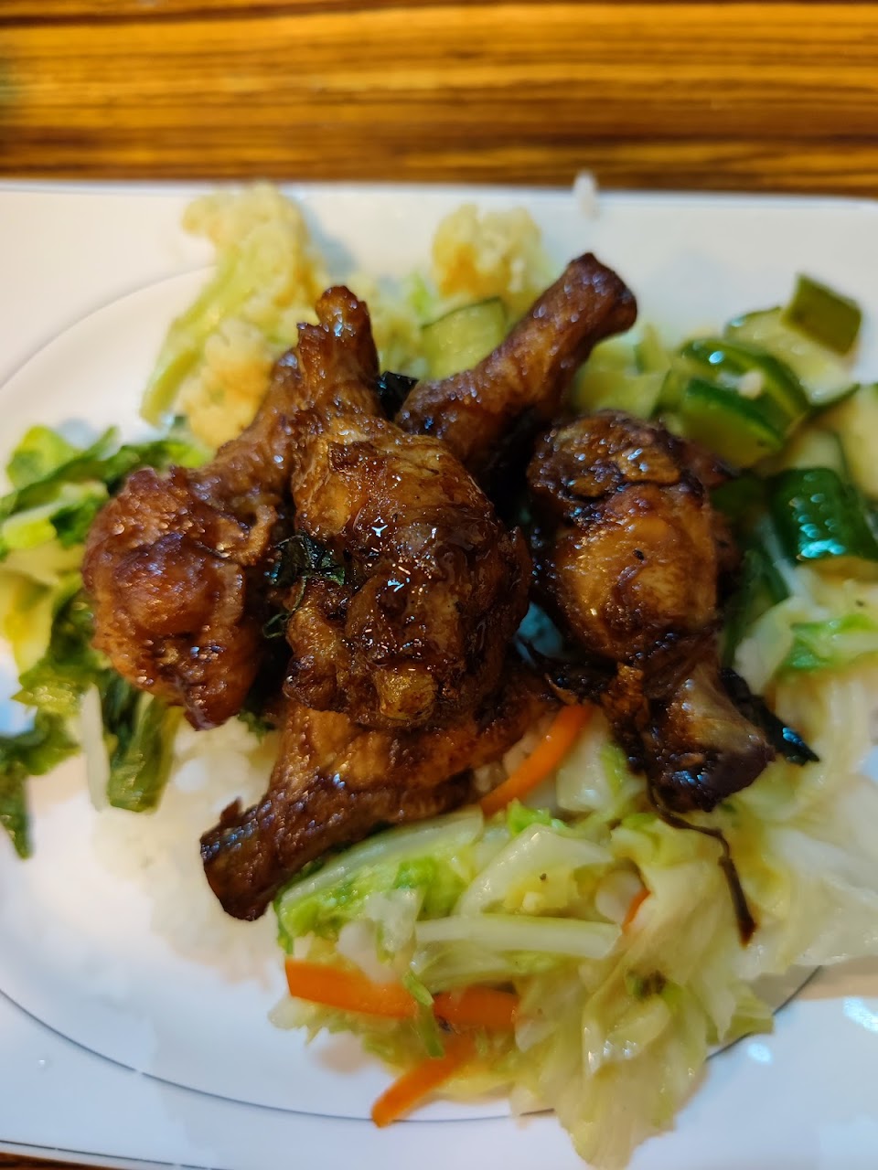 標榜低油低鹽,店內用餐環境不大蠻多外帶客人的,內用有飲料紅茶跟熱湯,湯裡面白蘿蔔很,雞排比較讓我失望,雖然蠻大塊的,但厚薄不一肉質柴而且炸的很乾硬,我覺得左上角那塊應該是白斬雞的肉還比較好吃(老闆多夾的,可惜沒點)