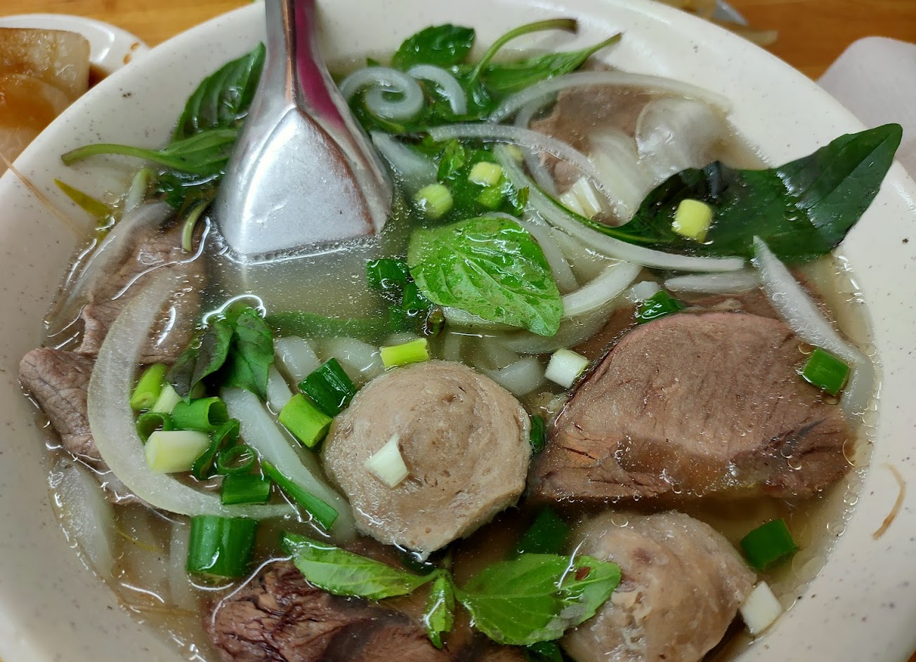 在那區域用餐時間有位置坐,可以讓人很輕鬆的用餐,招待小菜很入味,河粉可以隨客人客製,每桌都有九層塔可加入湯內,是越南菜的特色也很搭。