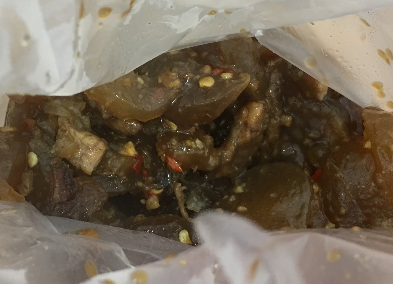 我覺得很像熱粉粿加肉和蒜蓉醬,大家可以想像一下這個口感,看看自己能不能接受喔。
