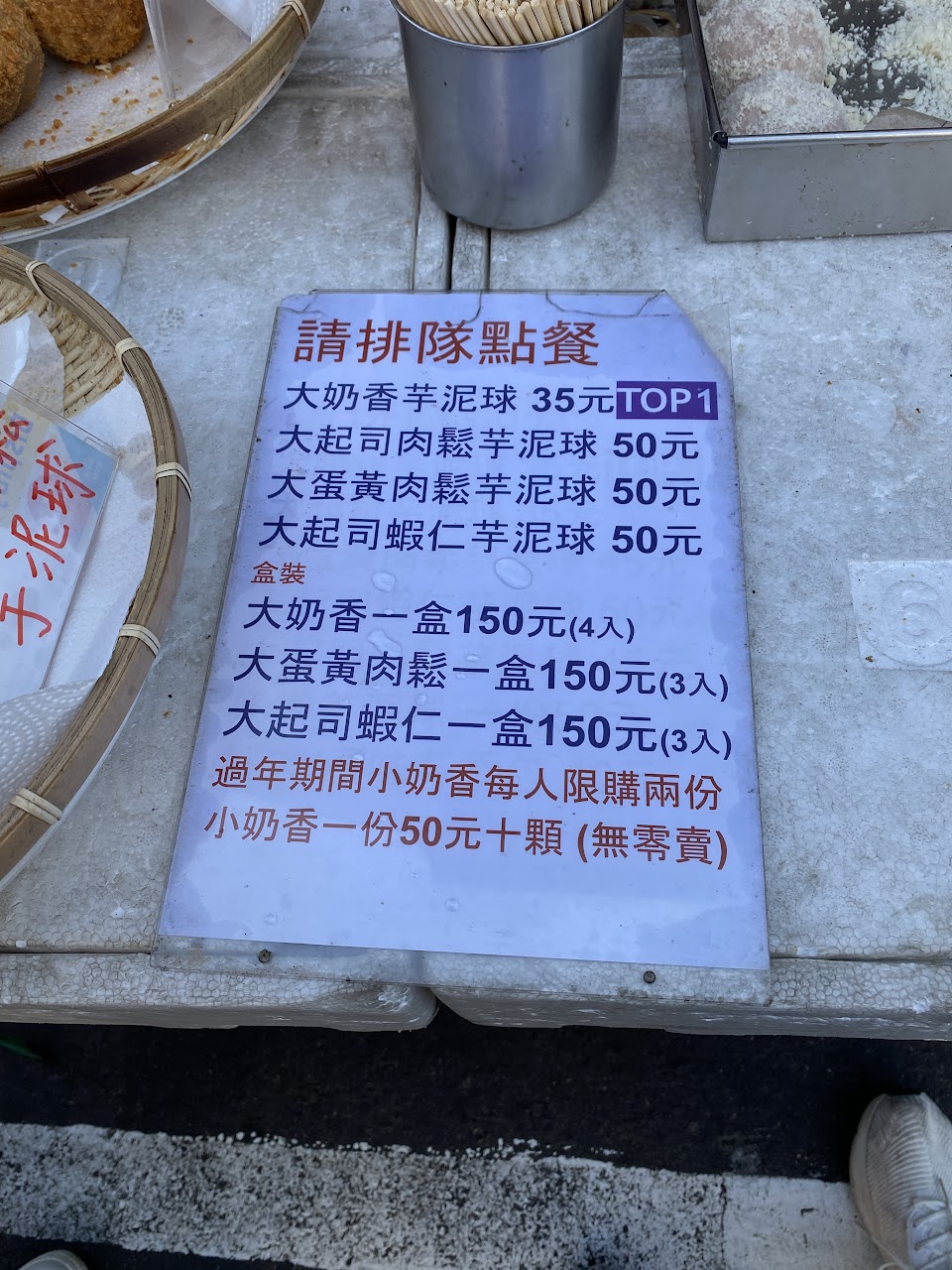 簡直是用了畢生的耐心在排隊!老闆超級忙,很多人一口氣買了十幾二十顆!但真的好好吃,沒吃過這麼有彈性的芋泥包,起司蝦仁超好吃!