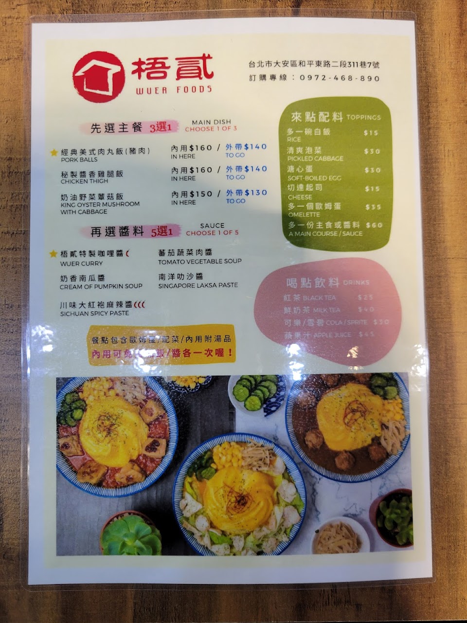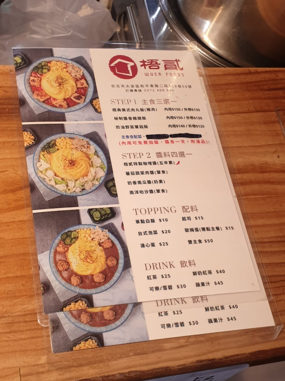 PS. 看DM說內用可以免費加飯 & 加醬各 1次 (可選不同醬:梧貳特製咖哩醬/奶香南瓜醬/川味大紅袍麻辣醬/番茄蔬菜肉醬/南洋叻沙醬),但要內用的話感覺需要稍後一下,每次路過都高朋滿座