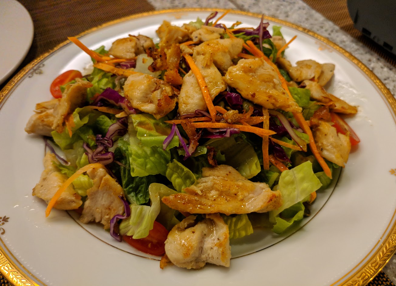 餐點的部分,雞肉沙拉份量十足、而且是熱的,基本上可以當成開胃菜吃。雞肉有調味處理過,並非一般無味的水煮雞胸肉,和沙拉醬汁的酸鹹甜風味非常平衡。
