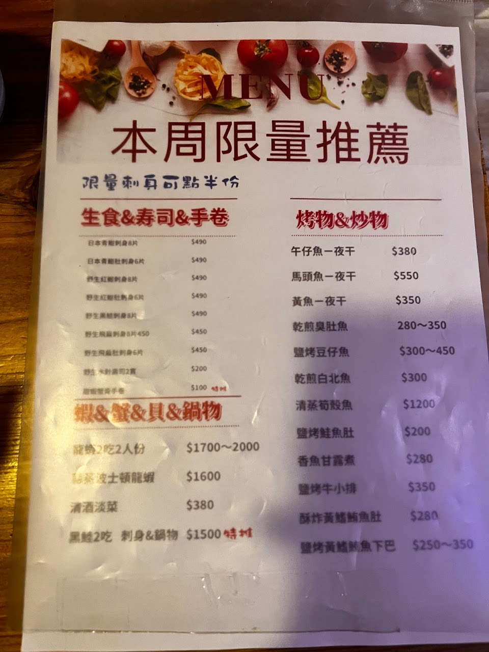 但吧台師傅都不戴口罩,還一直在聊天說話,而且用切生魚片的手直接接過客人點餐的菜單,衛生部份很有進步空間