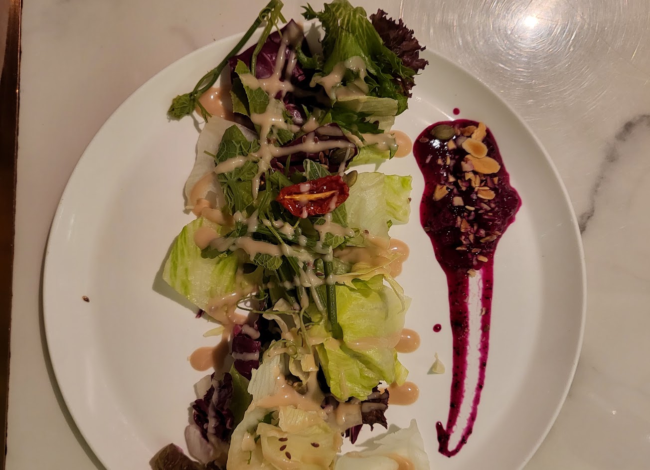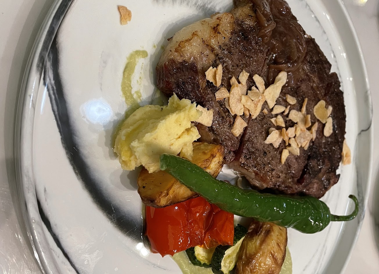 真覺得餐點可以改善讓整家店更好,沙拉像是弄好全擺冰箱久放吃起來口感不好,南瓜濃湯喝到蠻多硬硬的南瓜皮但很濃郁,牛排雖然告知有筋,但沒吃過牛排是讓人根本咬吞不下去的,半雞肉質很柴,戰斧豬排很硬,感覺是烹飪方式?主餐部份可以加強,但服務態度好氣氛佳。