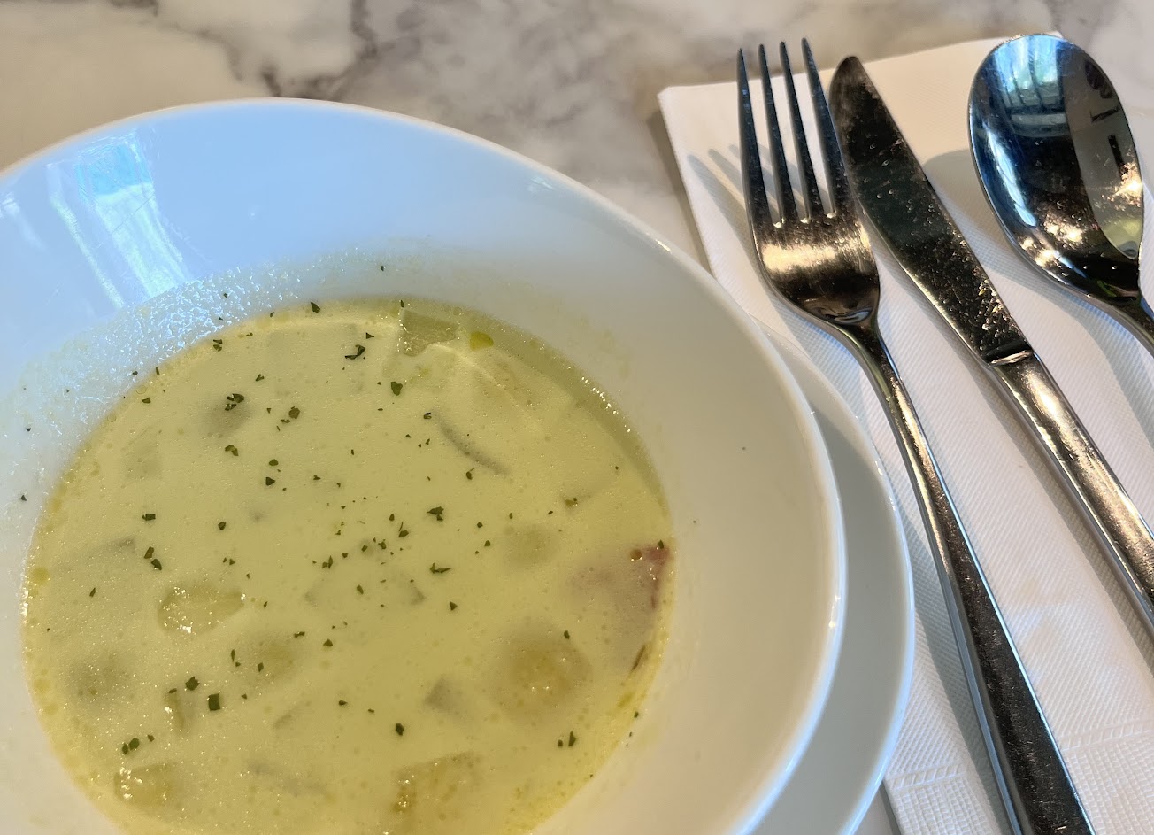 音樂非常大聲顯得很吵雜,點餐的感覺一言難盡…主餐味道普通,湯喝起來就是南瓜泥加牛奶,甜品給人感覺很廉價