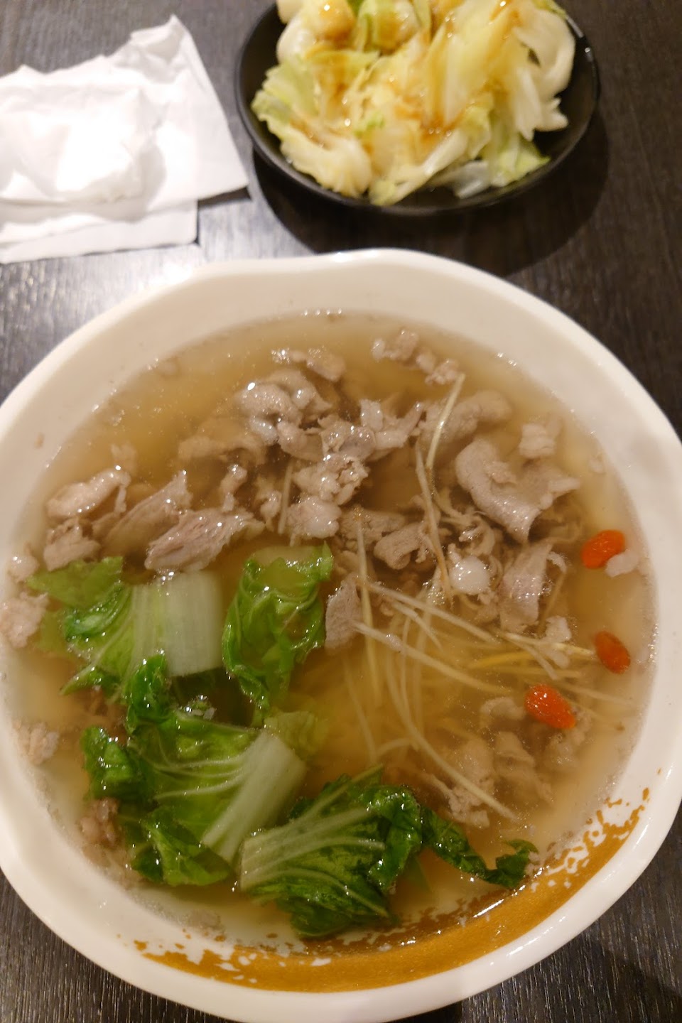 第一次來,點肉骨茶冬粉,蘿蔔軟硬適中,有口感,肉塊份量足夠,肉質不柴,喜歡啃帶骨肉的大推,湯頭口味也很喜歡,不過對肉骨茶瞭解不多,是不是道地就不評論。整體很好吃,會再去試其他品項。