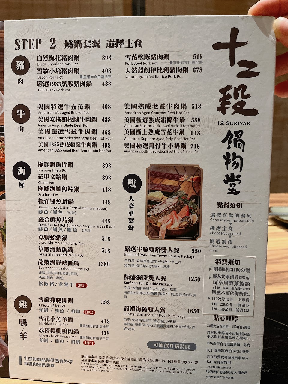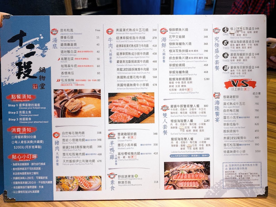 2人點雙人餐 有3種豬肉和3種牛肉,豬肉也非常嫩,連生日當月壽星選擇的肉片(梅花豬)也很嫩。 湯底選石頭(蒜頭,洋蔥)味道非常好,只要+10元。服務人員會陸續問加湯底,倒湯底時另一支手會遮一下防止客人噴到,非常的禮貌及客氣。這邊還提供撈油網,是其它火鍋店沒有的。 喜歡的除了肉很嫩,還有明治冰淇淋,每個口味都試了一小口,最愛的是紅豆和草莓的。 以女生來說,雙人餐就可以吃的非常的飽。