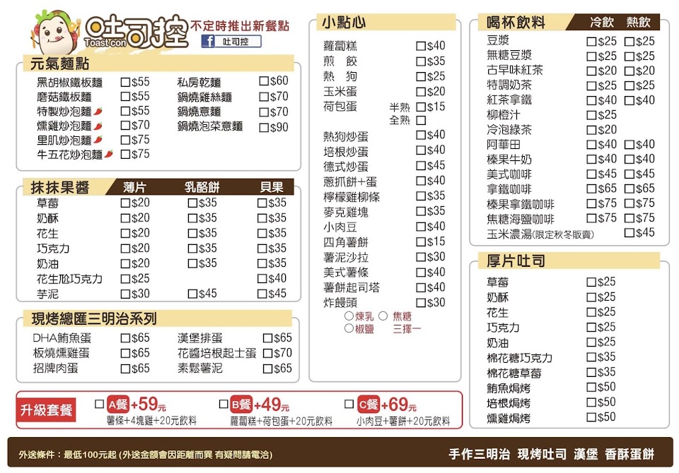 使用外送平台訂購 馬鈴薯吐司好吃,有蔬菜。 玉米蛋餅加起司泡菜花生很夠味,泡菜偏酸不會太辣,皮脆,有小黃瓜。 豆漿偏淡,約半糖。 紅茶滿順口不會苦澀,約半糖。 榛果牛奶好喝,濃郁不會太甜。 素鬆蔬菜吐司,有不少苜蓿芽,但口味調配好吃。 玉米濃湯口味很不錯,和一般不太一樣,不過口味稍鹹,胡椒味重。 板燒雞肉蛋餅好吃,口味重,沒有切的。 泡菜燒肉捲餅,口味不錯,也有含苜蓿芽,辣度微微而已,泡菜偏酸。