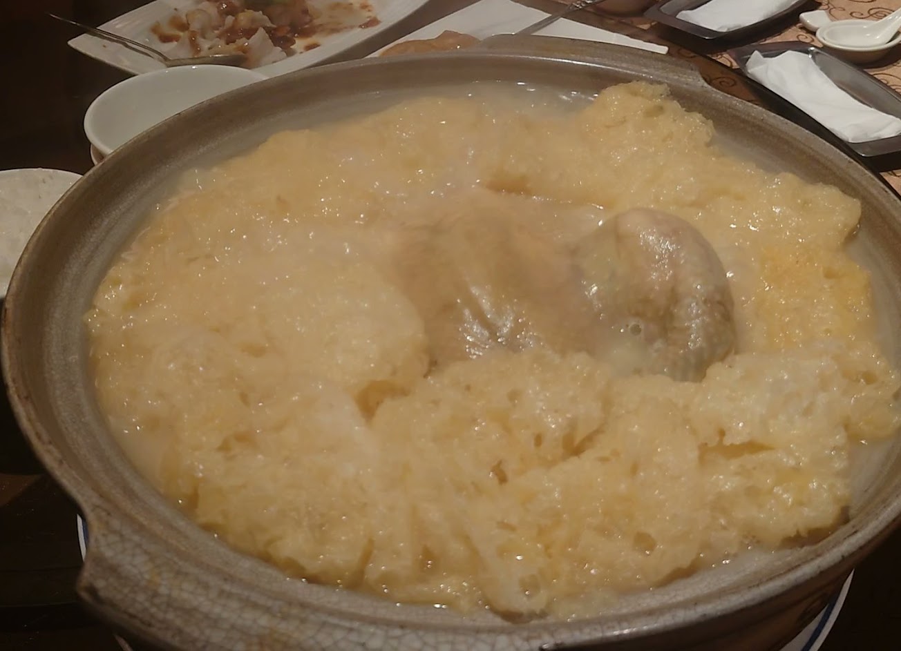 竹笙雞湯非常濃郁卻不油膩,雞湯耗時十幾個小時熬煮,是顧及火侯及工法才得以練就的好功夫,砂鍋看得到滿滿的金黃色精華膠質,其餘菜色各有優缺點,這次用餐還點了蔥餅包京醬肉絲、鱈魚、鍋餅,整體而言很推薦,適合多人聚餐,缺點是距離捷運站較遠~