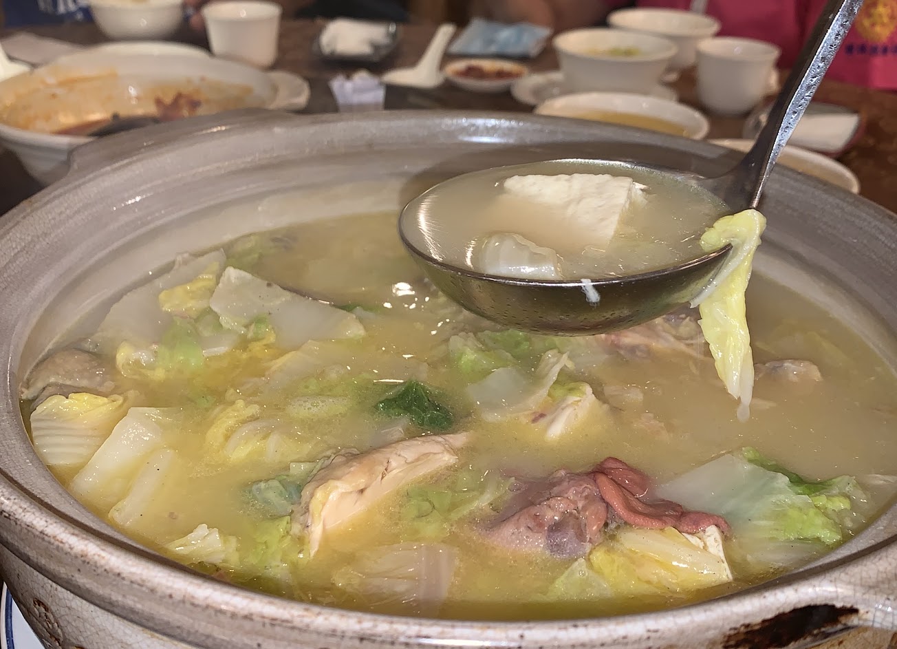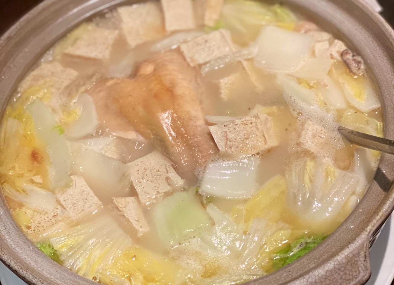湯喝到一半,再加入白菜、凍白腐煮滾,原本濃稠的湯頭則轉為清淡、並帶有白菜的鮮甜,「最好喝的雞湯」非浪得虛名。
