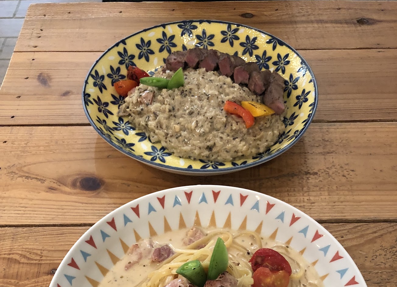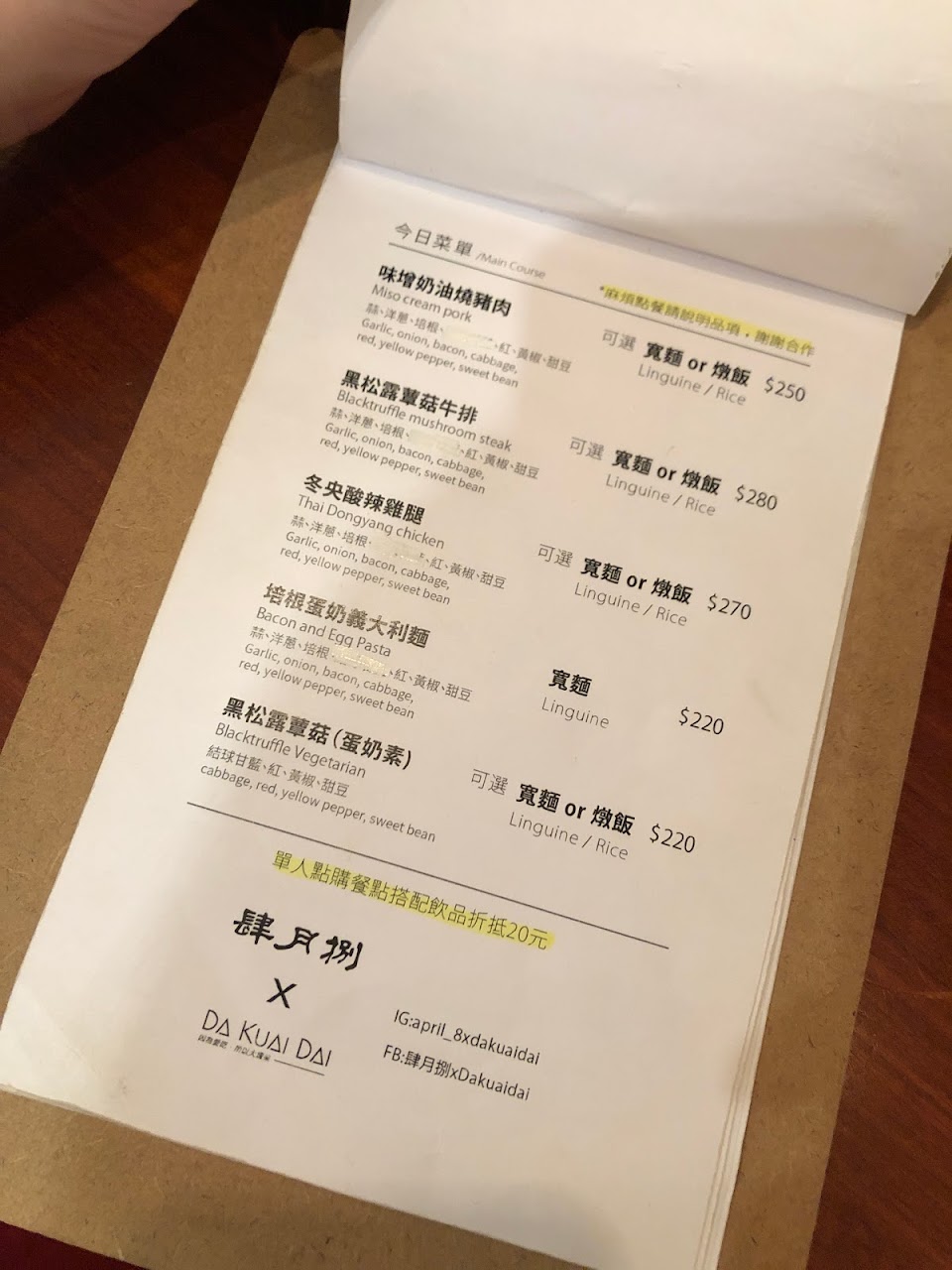 7/16當天提早了30分鐘抵達,因外頭下著雨,詢問後老闆願意讓我們提前入座。 餐點是黑松露蕈菇牛排燉飯260$/味噌奶油燒豬肉燉麵260$;燉飯的軟硬度適中,吸飽湯汁後的米飯很順口,牛排較無香氣,但熟度適中仍保有肉汁。燉麵的奶油醬汁濃稠但不死鹹,我有把醬汁吃光?