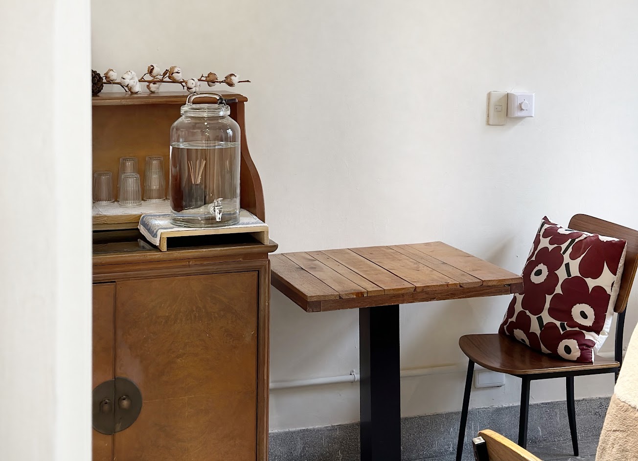 20221223新址 從西區搬到大里 離我更近了 新址一樣是老房改造 佈置後還是很美很有味道 尤其門口的柱子也太懷舊 太有特色 是小時候阿嬤家裡會有的那種三角橢圓形三色小磁磚 廚房後面那片牆上的磁磚也是很有年代感 但很美