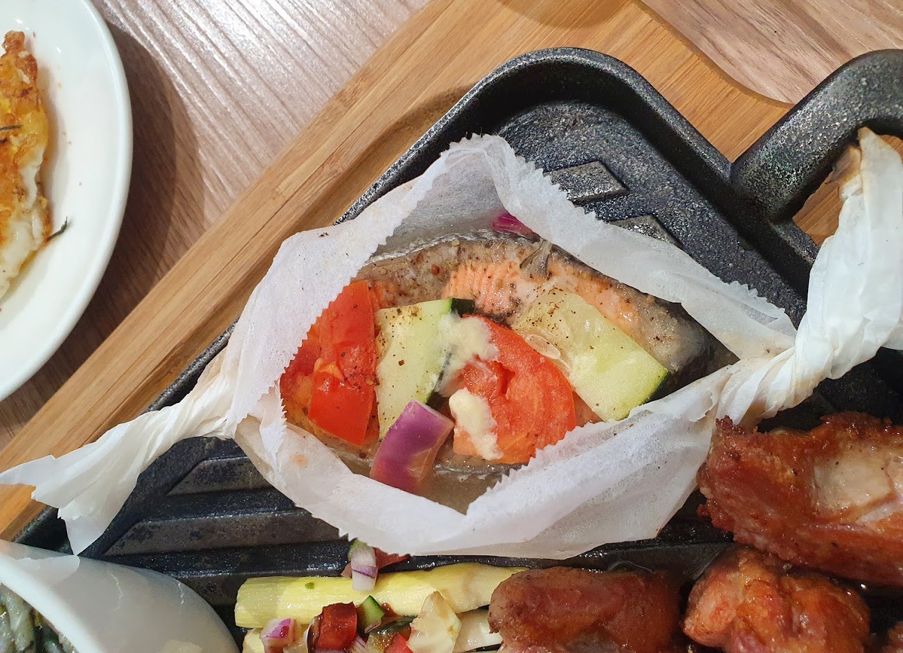 1:鴨腿部分皮煎地很酥脆,但紅酒醬味道很淡,跟肉類也不搭;紙包的是小塊鮭魚,肉偏硬了點。