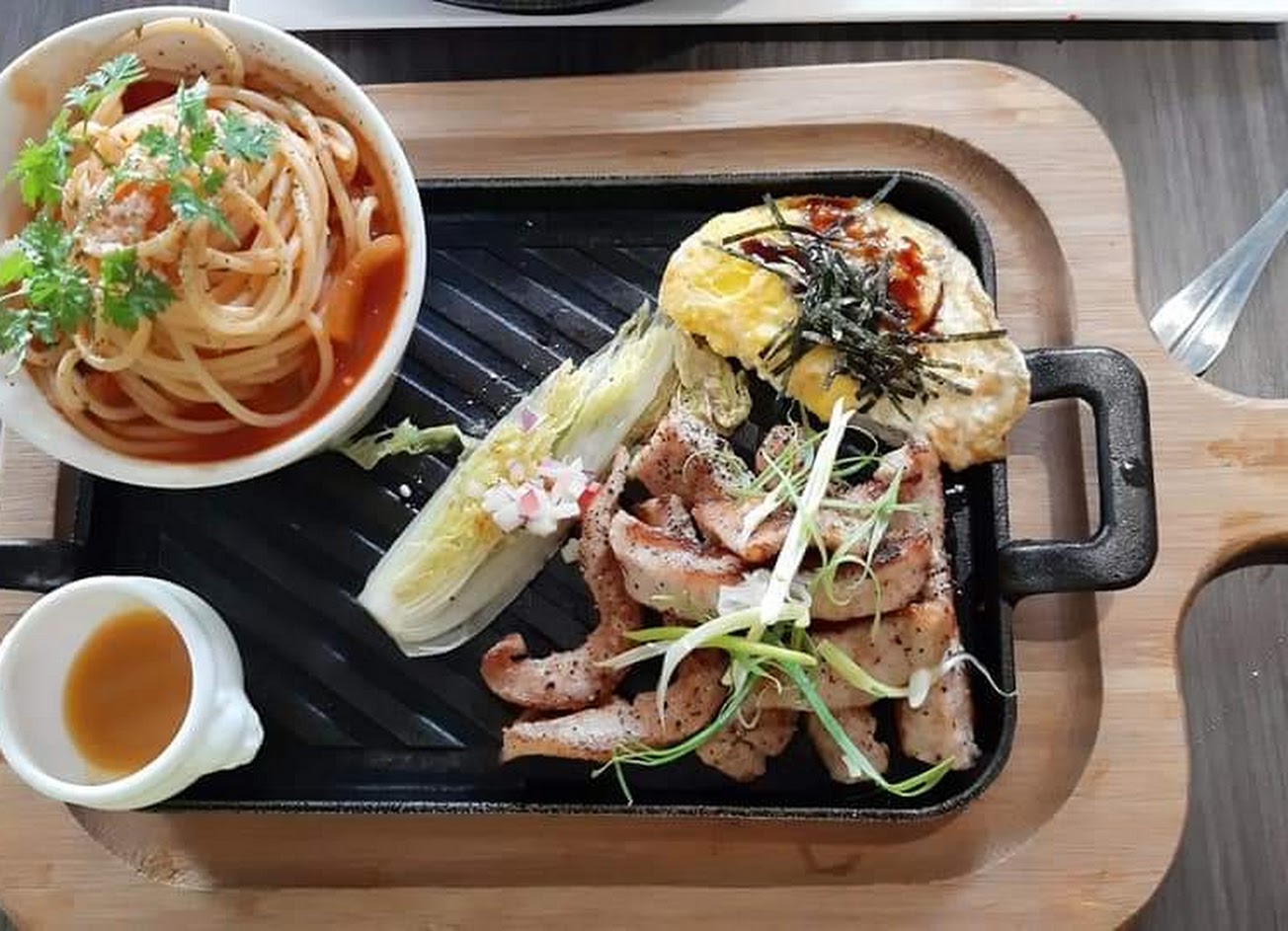 鐵板麵的白醬不建議點 因為不是傳統的白醬 而這邊用的是豆漿為基底 口味真的是怪 完全吃不下去