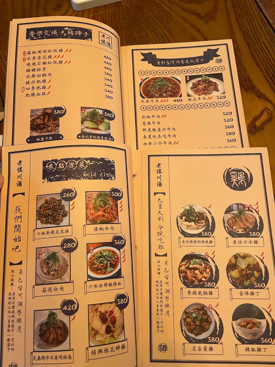 紹興醉雞、水煮牛、回鍋烘蛋、金沙杏鮑菇、老皮嫩肉、四季肥腸居家、空心菜