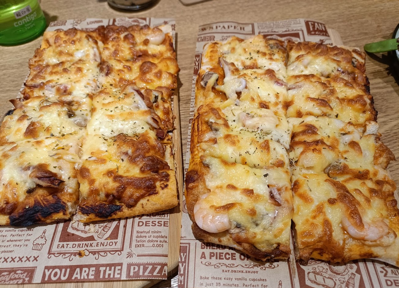 東西是不錯吃,2大1小共花費1500多多,2個主餐1份披薩2杯飲料1份抹茶紅豆鬆餅,吃很飽,7:55前離場。