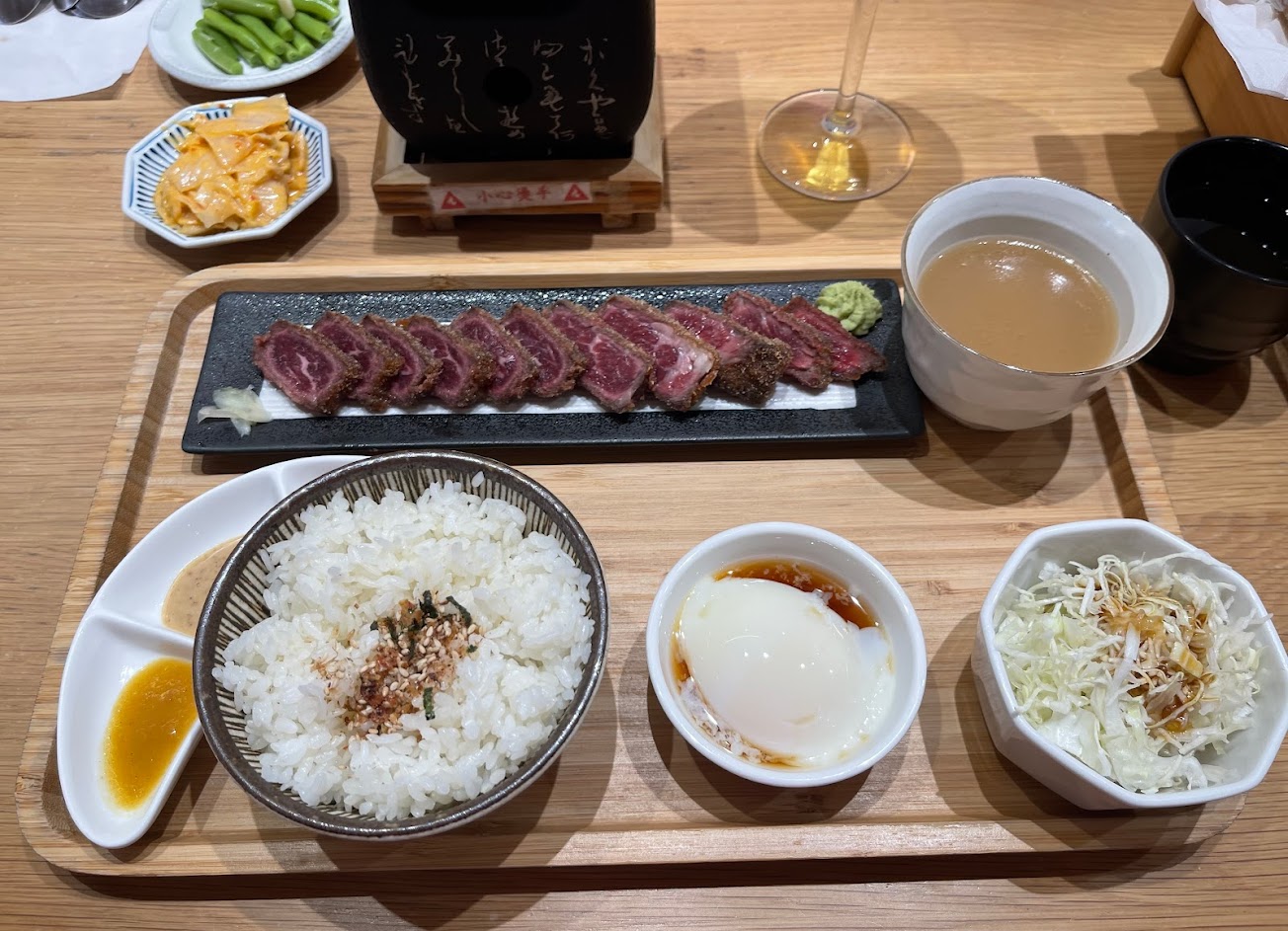 今天點了炸霜降紐約客,第一次吃炸牛排,真的很有趣,而且很好吃!重點是還給三種沾醬、芥末跟薑,附餐的溫泉蛋沾起來也很好吃? 讓人想再回訪的滋味? …