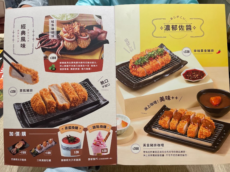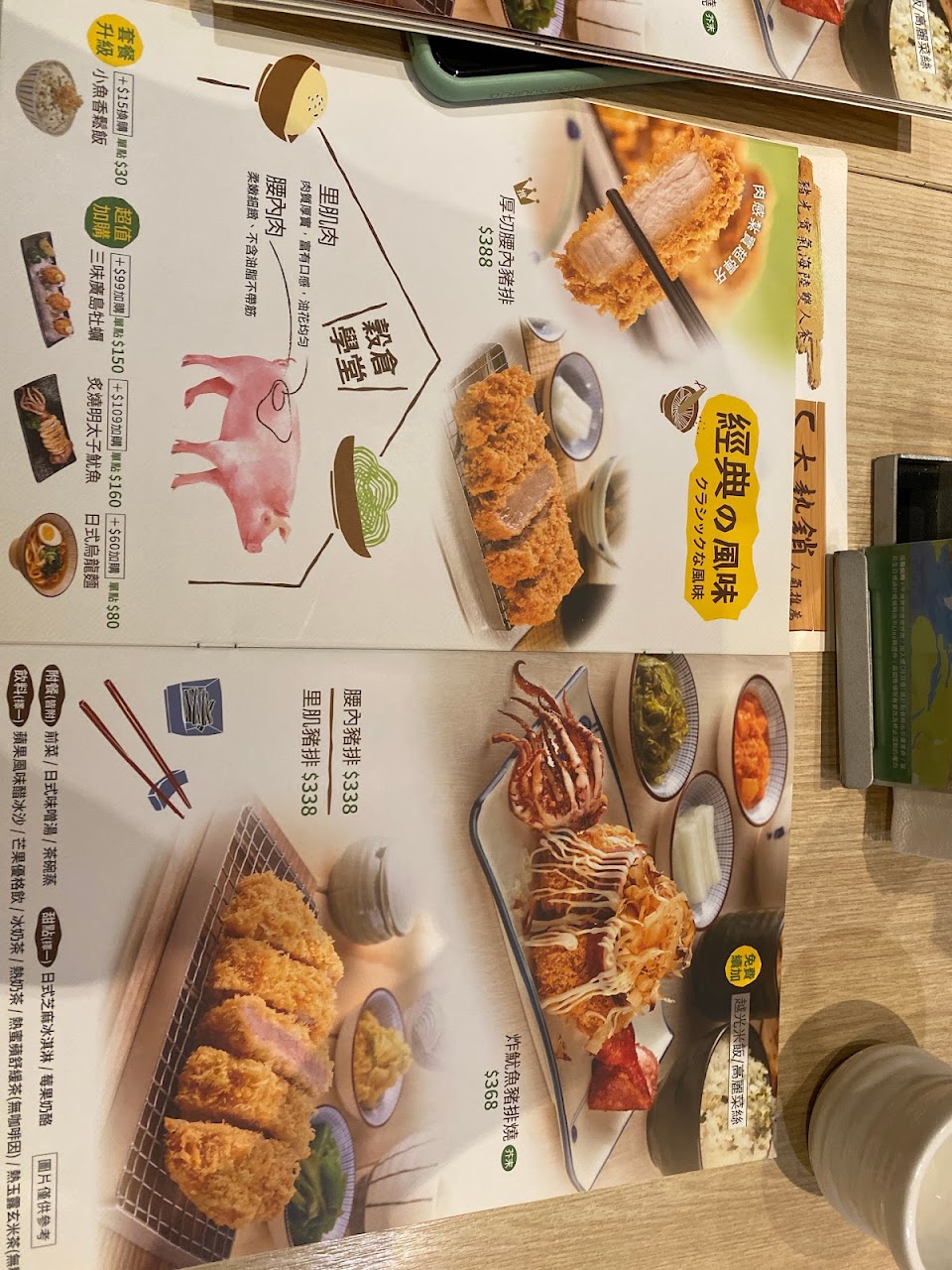 第一次吃日式炸豬排, 份量足夠, 主推厚切, 口感不錯, 小菜配置期望更豐富, 茶碗蒸覆上明太子, 死鹹反成敗筆(蒜硯或蛤蜊提鮮更佳), 炙燒魷魚因觸鬚冷掉即乾硬, 可提醒客人趁熱食用
