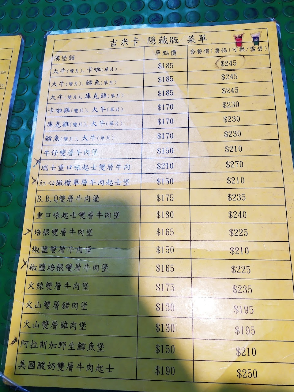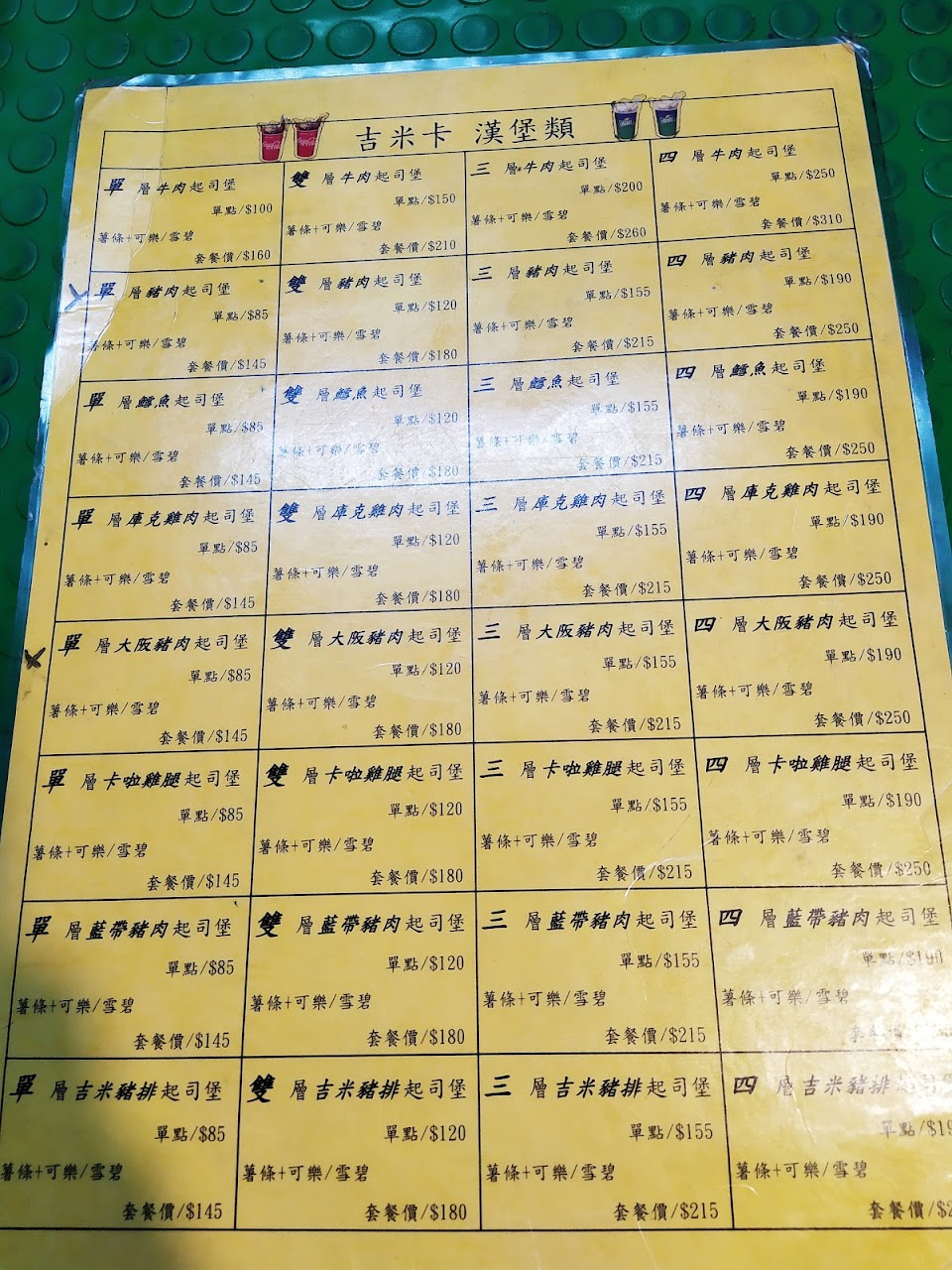 十年前開始吃老闆的花生熏雞潛艇堡,度過許多跟朋友的歡樂時光,可惜不買了~老闆也從中興大學最經典的帶悠閒感的店面,換到了這裡⋯⋯如果你喜歡吃美式漢堡,在台式乾癟漢堡,麥當勞大麥克,你可以來試試吉米卡美式漢堡~雙層牛肉厚實,遠勝大麥克,青菜非常豐富,應該可以能平衡吃漢堡的罪惡感~一個漢堡約200-240,換算現在麥當勞虛虛的套餐,不如來試試這個能得到滿足感的漢堡~老闆有時會有各種新奇的搭配,各種國家的蝦子、鮑魚,滿足大家味覺的跨國感~