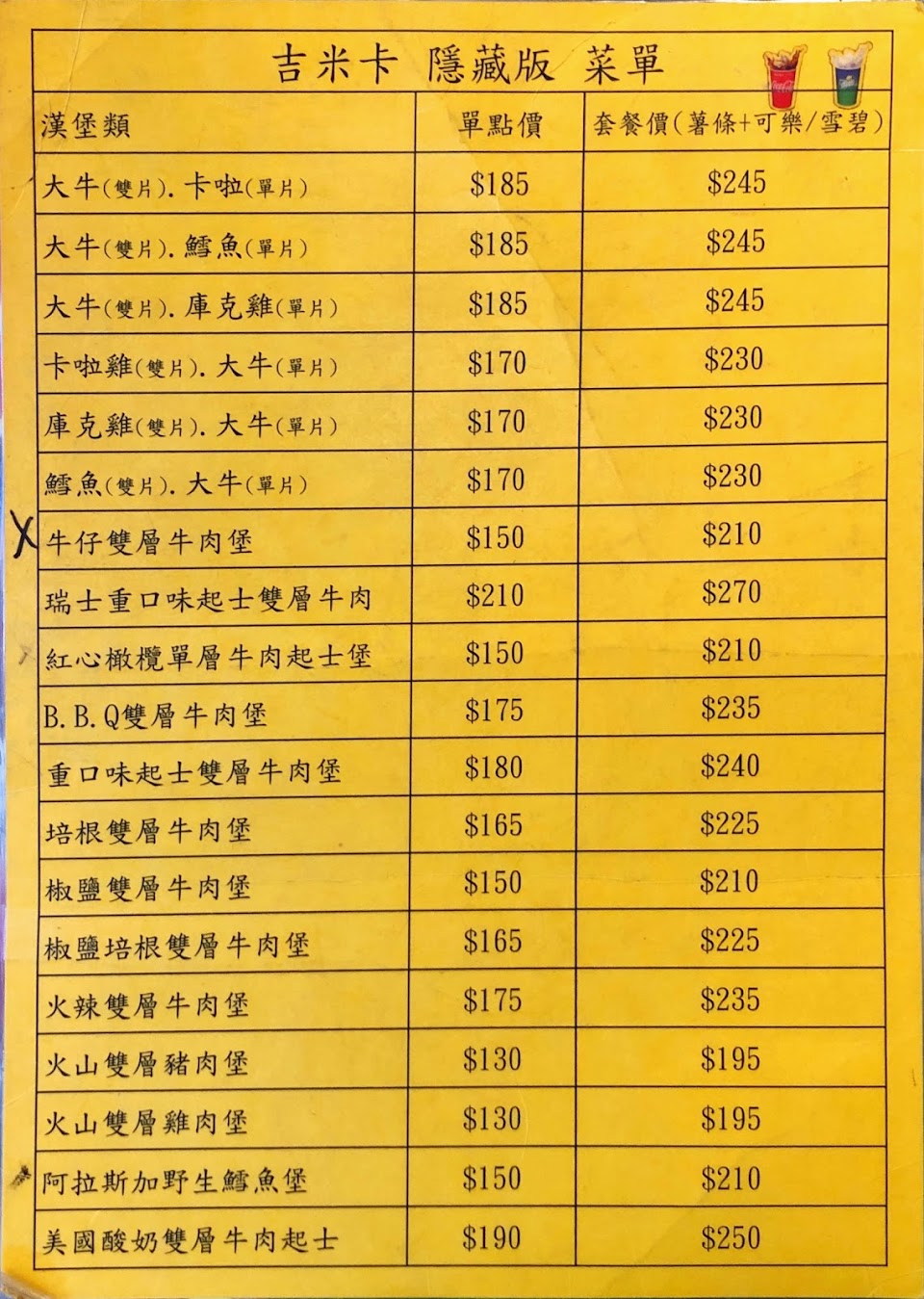 每個人心中都有排名,在我的心中漢堡也有她的排名,目前這家漢堡仍是我排名五名內的一家,漢堡一般來說不外漢堡包,肉品,內料以及總體口味的順口度,吉米卡在我吃過的漢堡中不敢說是最好的,但絕對是值得一試的,也是在我吃過的漢堡中老闆最用心的,以頻率來說也是我最常報到的一家,吉米卡的特色,肉與堡包是走一中間保守材料,但老闆的經驗與愛漢堡的感情,將普通的食材cook的超出它原本的風味,再加上老闆不斷的嘗試新的內料,總能讓人驚豔,讓我愛不釋手,但別忘了店名是潛艇堡,她的潛艇堡可是主打,豐富程度一定讓人難忘,是相當推薦一試的店!CP值也是很高的!