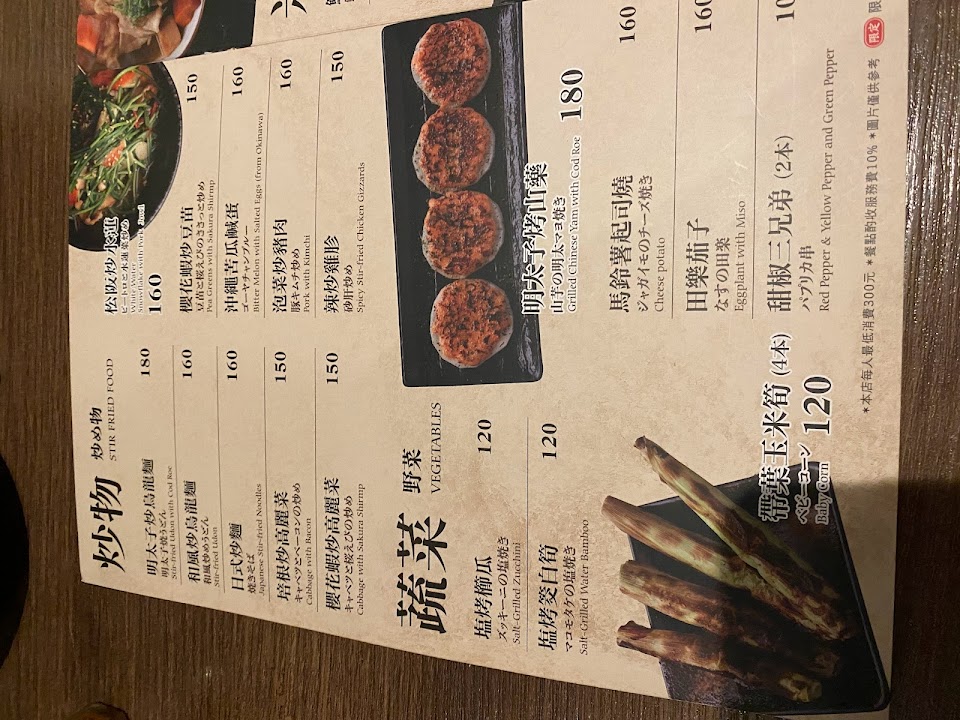 日式炒麵、水蓮松阪豬、串燒拼盤、炸牡蠣、雞軟骨、茭白筍、酒蒸蛤蜊、揚出豆腐、烤雞心、明太子山藥、生牡蠣、烤花魚⋯