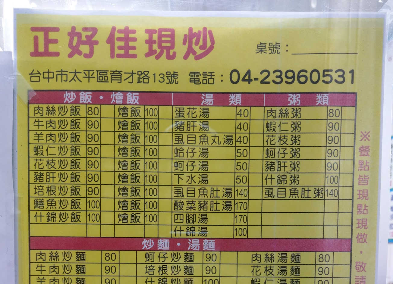 位於太平區育才路的正好佳現炒,菜色有很多很多可以選擇,口味合乎大眾化不錯吃,價位屬於便宜的好店,只是常常客滿,想要過去用餐一定要提早到,最好可以先電話預約位子,才不會等到餓肚子。
