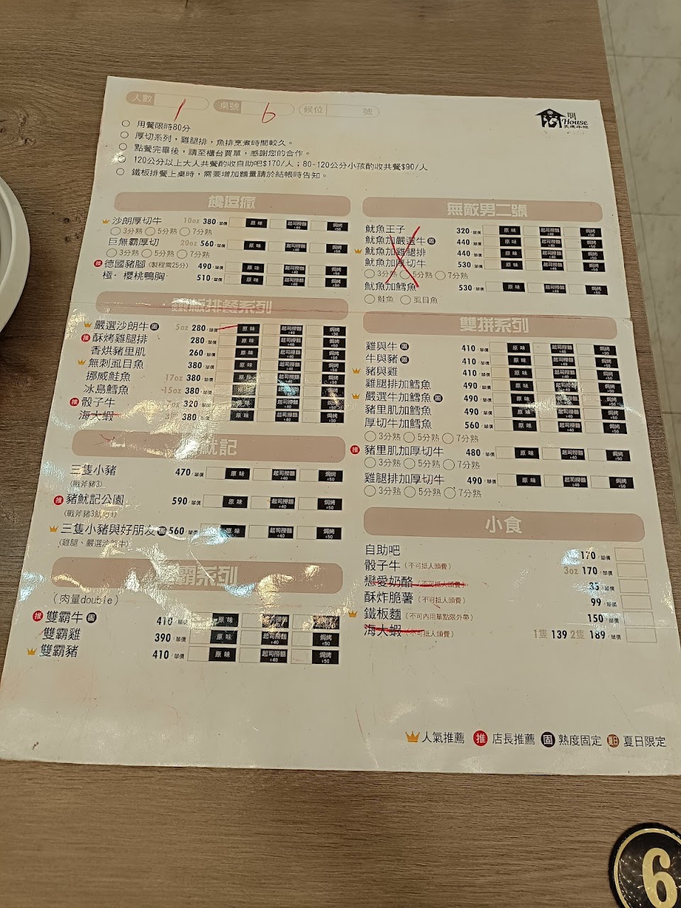 2.點了4個餐點:豬魷記、挪威魚排、沙朗厚切、豬與牛,結果服務員少點了豬與牛,後面我們發現了以後跟服務員說,並且完成了點餐,到了我們都吃完了張,豬與牛的餐點還沒來,我們過去詢問服務員為何餐點還沒來,服務員居然回我,你們這是加點所以要慢一點,我聽完傻眼⋯你們服務員少點了我們的餐點,我們發現去補點居然是加點,這什麼服務⋯給一顆星我都覺得太多。