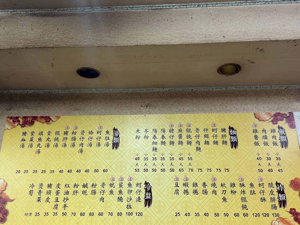 普、餛飩麵、陽春麵、粉腸、燒肉