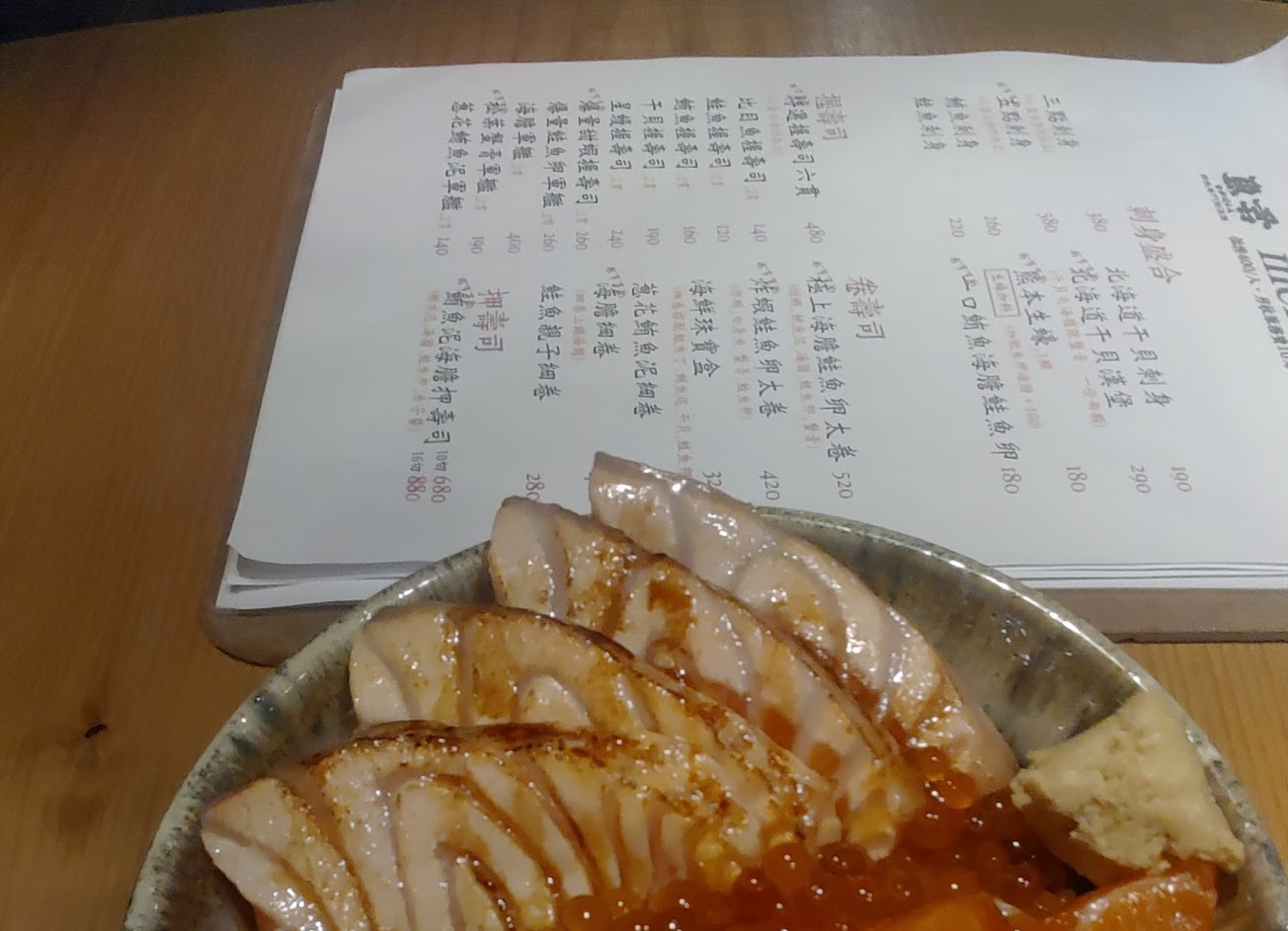 到場後店員告訴我們本日無海膽? 我們本來想吃三色丼的? 少了海膽 我們改點鮭魚親子丼 丼飯食材很新鮮 份量很充足 但總覺得少了些什麼?