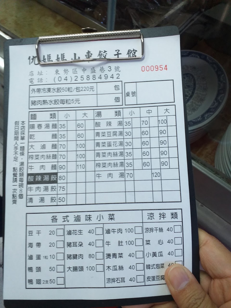 前幾日到這家店外帶,門口裝小菜結帳的女店員口氣差態度惡劣,以前買了幾次知道小菜是現場盛裝和其應有的份量,這回和友人合購外帶(四樣小菜、二份牛肉、五十顆水餃)請求盛裝時麻煩分裝成二份可合併綜合裝,該女不耐拒絕要我們自己分(因為小菜有湯水我們現場自行分只會弄的很混亂但也承受了)此女先前聲明小菜是一份一盒不願分裝,又已明知我們是二人有分開的需求,卻故意的將二份牛肉裝成一盒,被我們發現執疑應該是二盒牛肉?該女還強辯已合併放了!我問:你不是説一份一盒嗎?看我們都在分裝你怎麼還給我們合併?被要求後才擺臭臉不甘願地取回刻意到廚房去分成應有的兩盒。我們回家後各自打開牛肉,竟發現內容量根本只有昔日的半份、肉片還擺的亂七八糟,明顯故意的短裝一半等短給了一份牛肉,這家店除了拒絕以舉手之勞方便協助顧客的需求,又極不誠實的故意偷斤減兩超收一份錢,本來去東勢都會開車転去內用或外帶,此次經歷如此不誠實又惡劣的行徑,以後再也不願意前往,同時奉勸親友及慕名前往食用或外帶的人⚠️要非常注意核實帳單及內容,看過去的評論發現原來我們也不是第一位被不誠實對待,又發現有些類似評論出現在另一家山東餃子館是不是網友評論並沒有搞清楚到底是哪家山東餃子館就寫了?本來我也搞錯了,還好仔細查看地圖才發現應該是這家才對,總之這樣的行為真的非常令人厭惡,再也不去了!