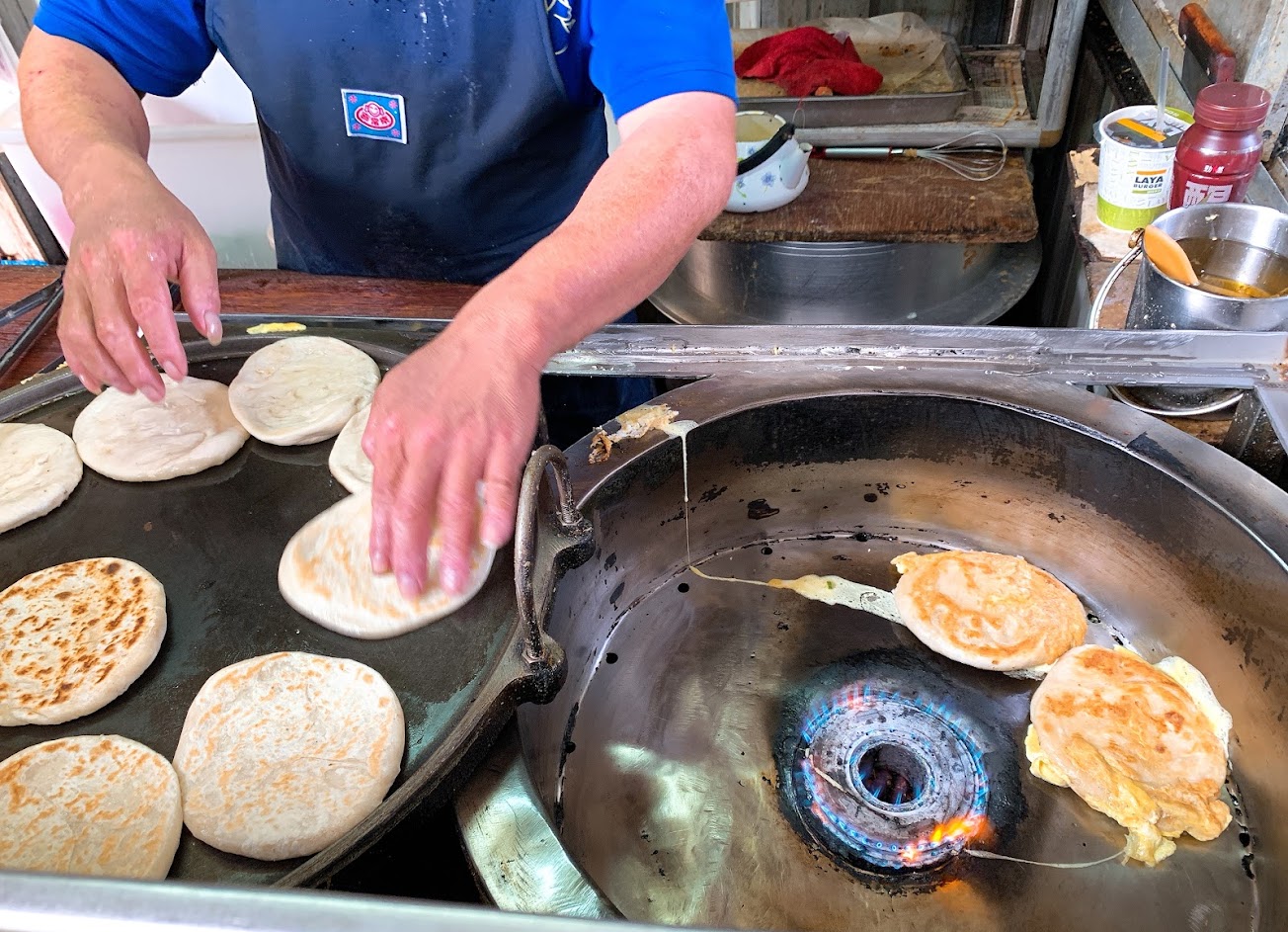 這裡早餐特色就是灌蛋餅,先做一個圓燒餅,再來中間挖洞將蛋打在洞裡,完成灌蛋餅,只賣35元。為了要吃這個足足等了一個小時,吃到時候,果然不錯吃,老闆制作工序太多買的人又多,才等那麼久。不過要來這裡,心裡要有準備,真的等很久。