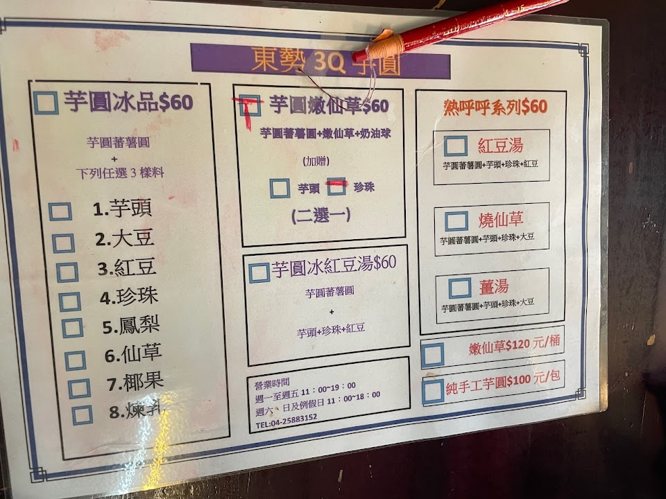 不甚起眼的店面,是在google搜尋到東勢超過百人評鑑的芋圓店,果然沒讓人失望。芋圓地瓜圓都超好吃,很Q不會太硬,芋泥口感好好!老闆人很客氣,可以加冰加糖水,因為料真的很多?? …