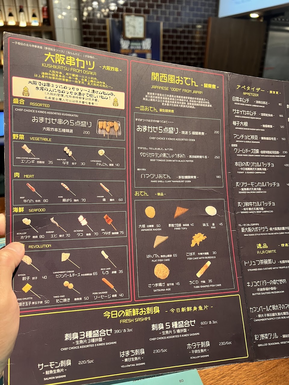 是個很有趣的地方,這裡的氛圍充滿著濃濃的昭和風,店裡播放的音樂幾乎是小時候常常聽到的日本連續劇的主題曲,或者是港台歌手有翻唱過的歌,每一首都令人懷念,店裡的裝潢元素也非常的有趣,不管是任天堂紅白機,電玩小精靈的裝飾,擺放在牆上的宮澤理惠的寫真集,九零年代的偶像照片,六七年級生應該都會很,料理的話,以居酒屋常見的菜色為主,東西味道都不錯,但我個人喜歡他們店裡的氛圍大過食物的料理,是個很適合一群朋友坐著邊吃邊聊邊喝酒的好地方。