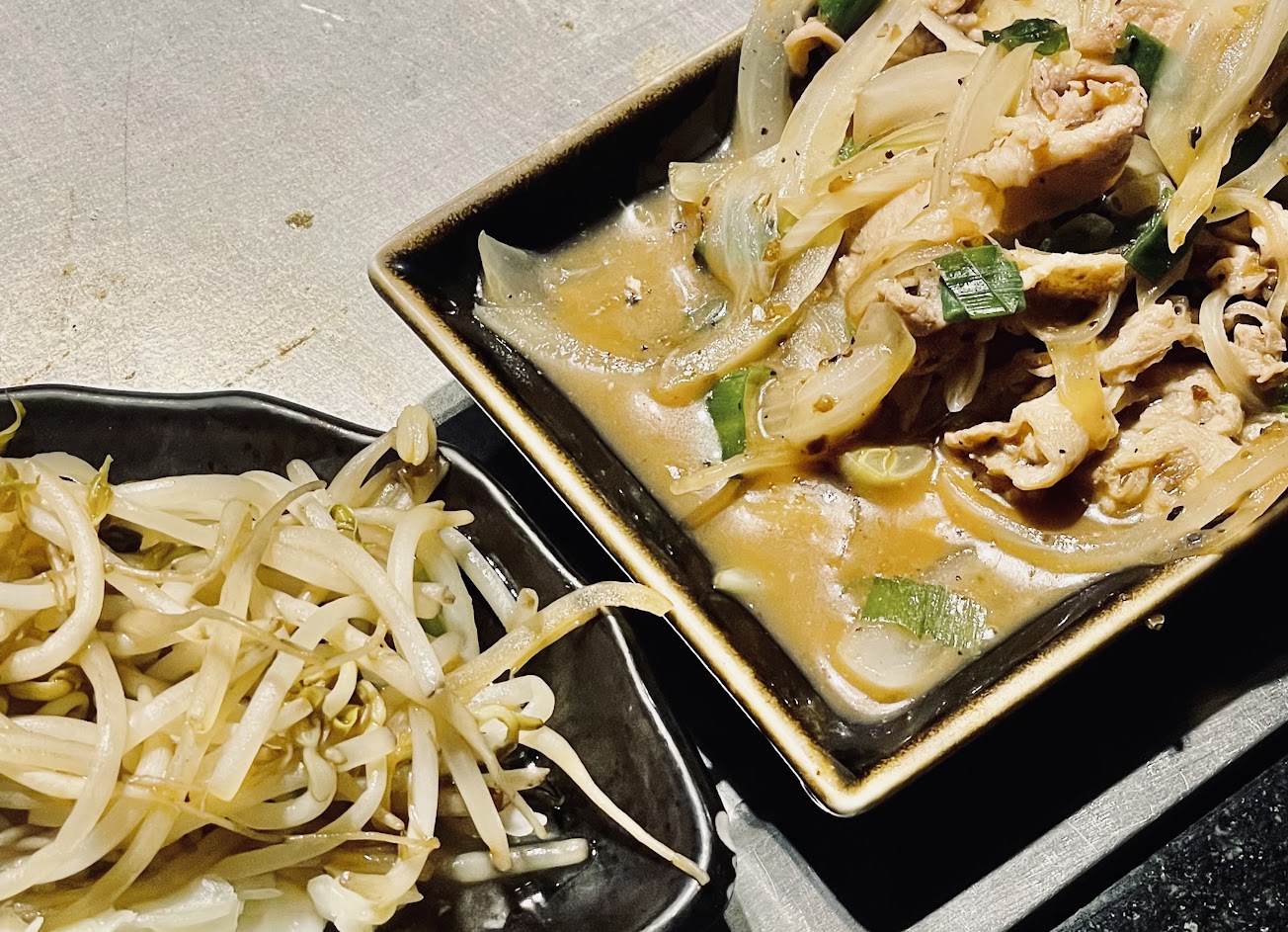 Spicy cabbage and bean sprouts, omelette, crispy tofu.
