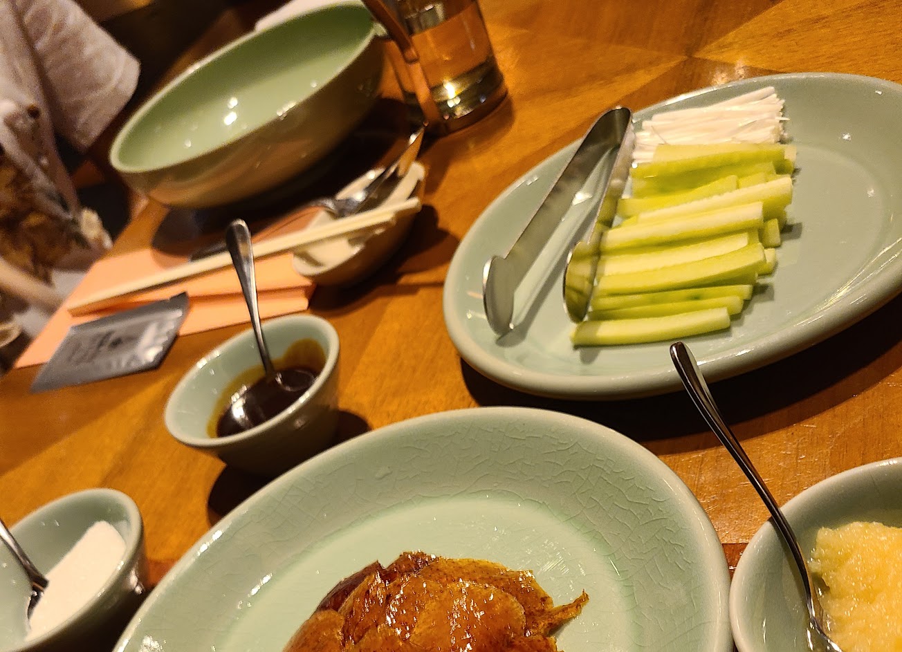Peking duck is skillfully sliced in front of the guests and divided into 3 dishes: crispy duck skin, duck breast meat and duck leg meat.