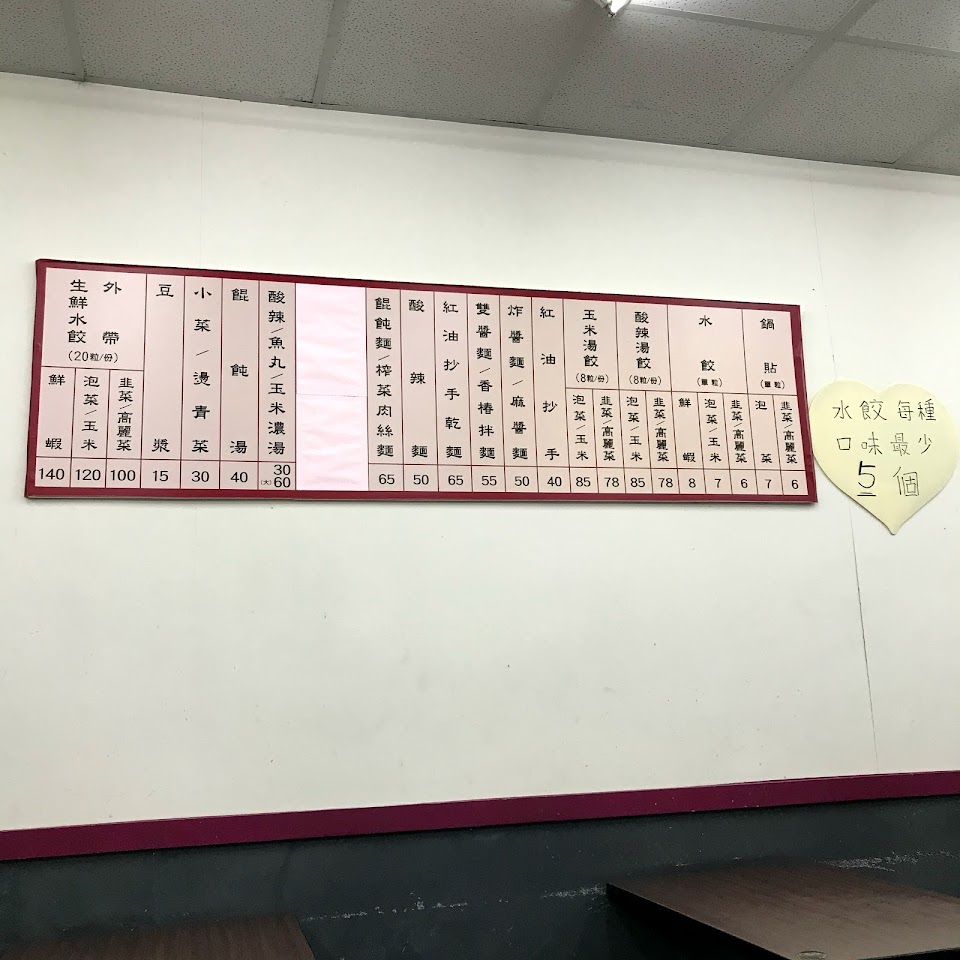 老闆動作很快,鍋貼外表很香酥,水餃內餡飽滿,個頭不小,泡菜口味只有微辣,是一般可接受程度,高麗菜和韭菜口味普通,就是中規中矩,店中提供免費冬瓜茶,不錯喝,尤其推薦調味區的生辣椒,超辣好吃,不過外帶的就只有市售的辣椒醬。小菜很多種每盤皆30元,價錢公道,還有餛飩麵等麵食與酸辣湯,是上班族可納入的午餐名單