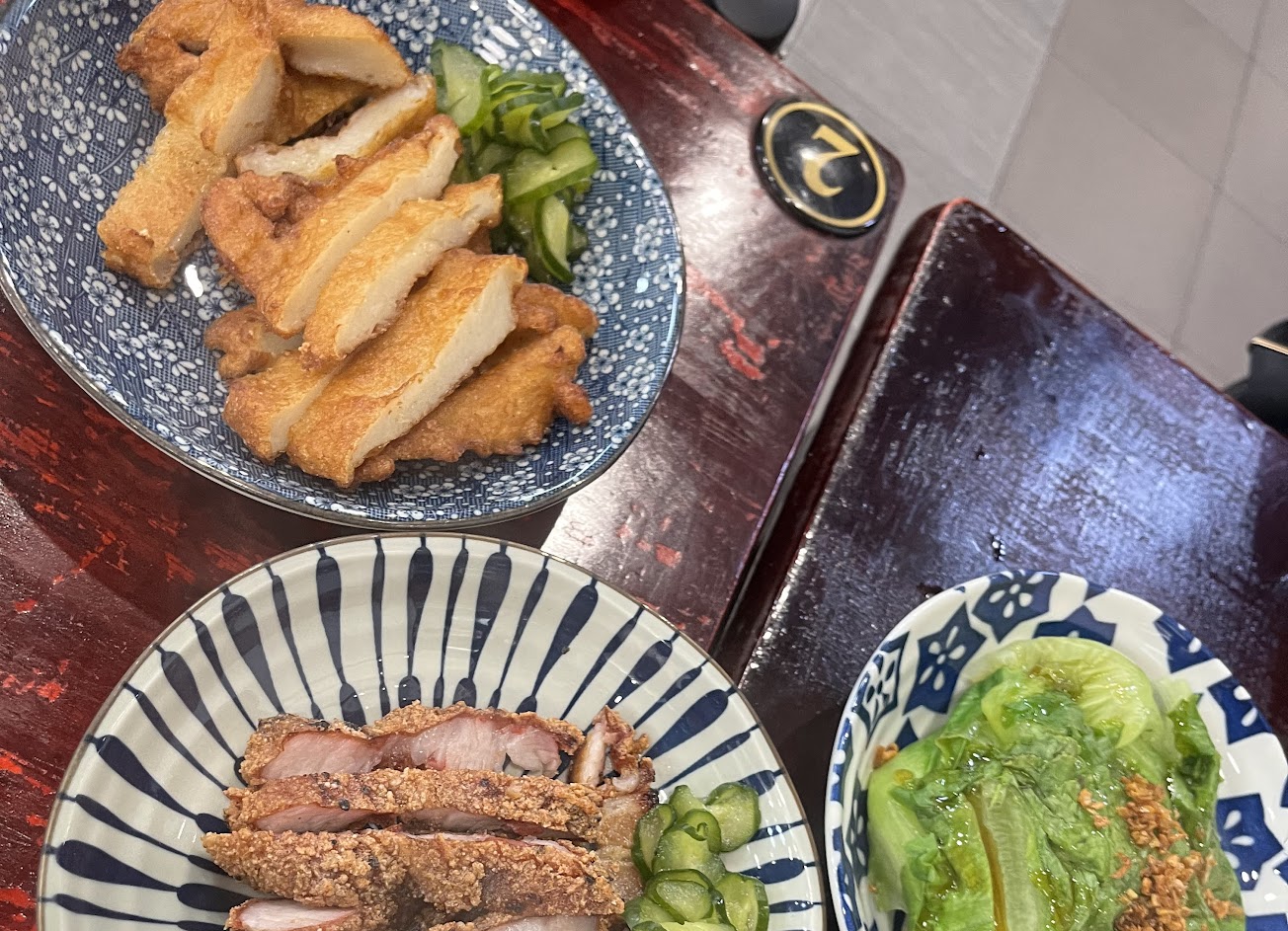 是家客人不斷湧進來的店,每天會有特別菜色可以點,當天點了蝦仁飯加量、鬼頭刀套餐、紅槽肉飯套餐和鱸魚隔離粥和雞捲、炸豆腐,套餐有附飯和四樣小菜,大推紅槽肉飯、雞捲和炸豆腐。