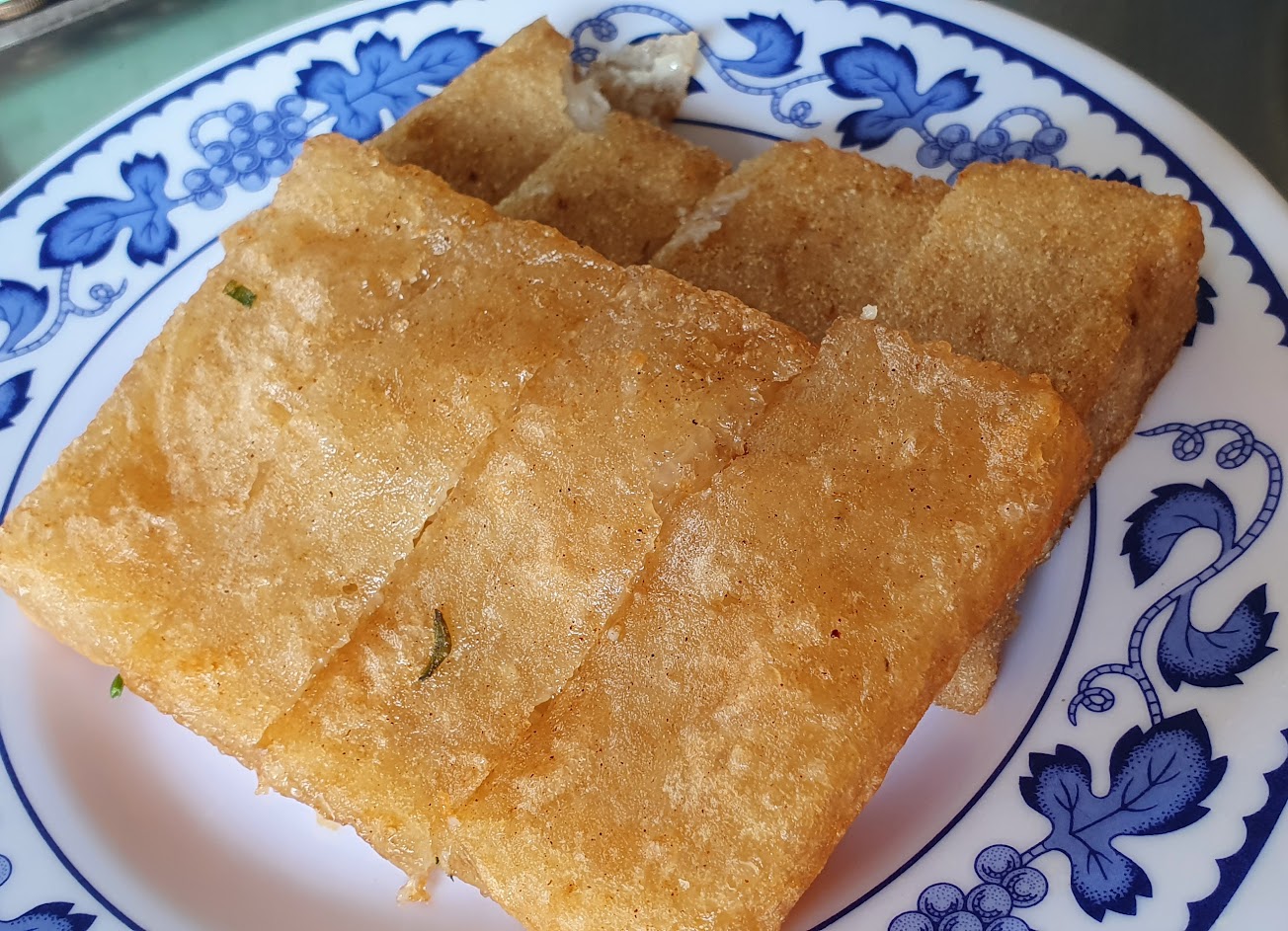 炸的火候不錯,不會油膩,趁熱吃,外皮香酥,鹹粿是芋頭粿,肉炸裏面加的是大頭菜絲喔