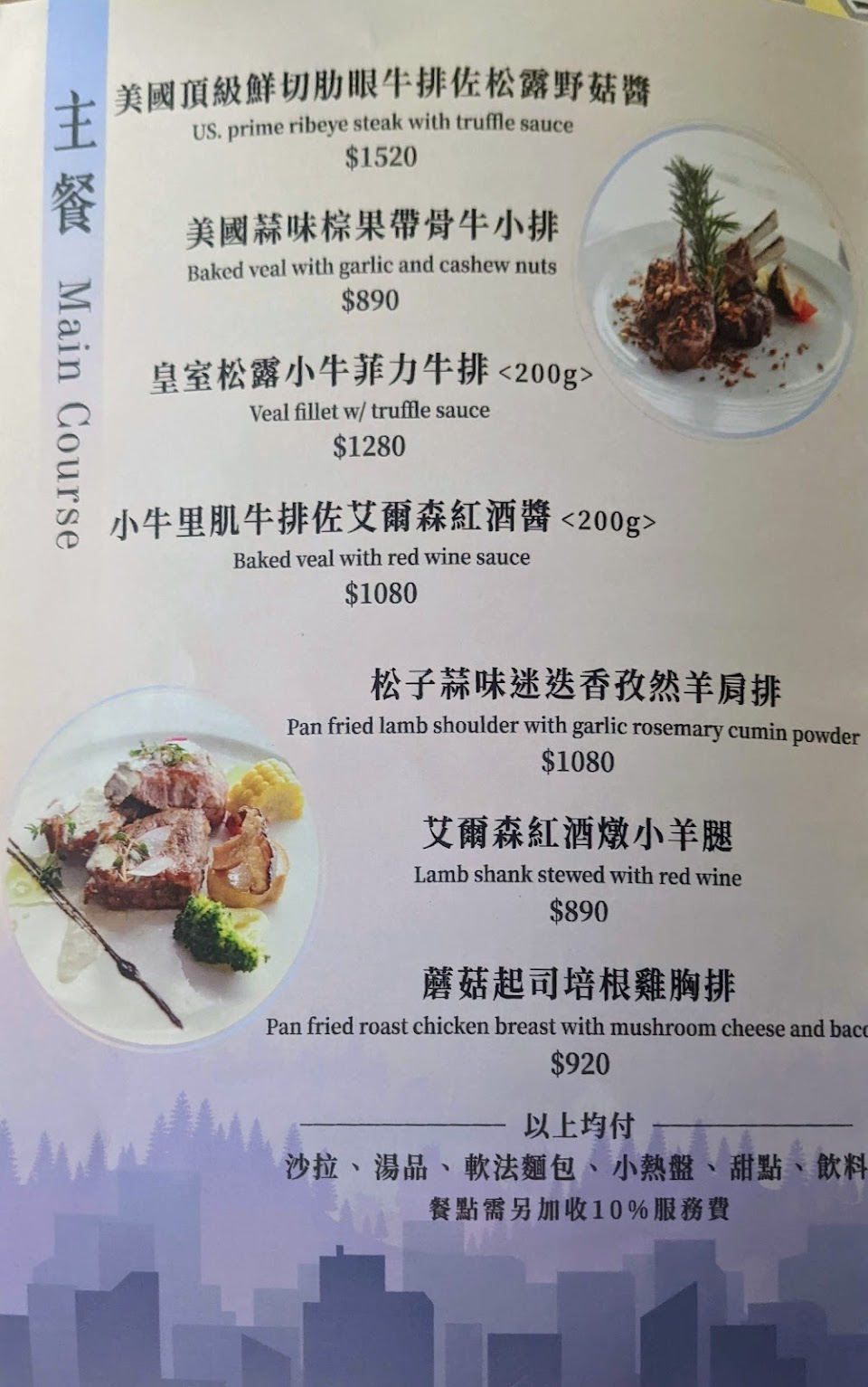 晚餐套餐介于790元至1080元(需加一成服务费),豪华餐点1480元。建议先打电话订位,并且可以问问看服务人员有没有其他优惠?……
