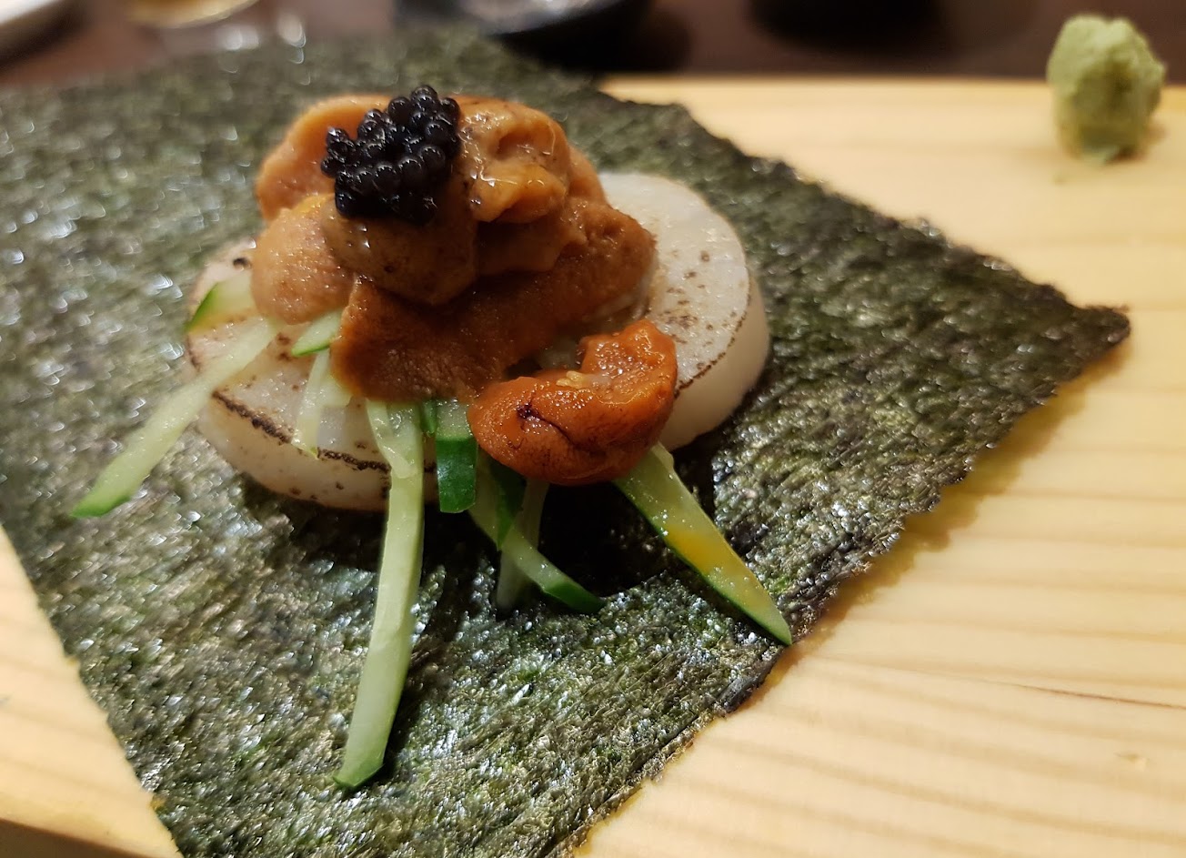 茶碗蒸加了魚卵好吃,蝦手捲海苔超脆,很搭蝦,米飯;鰭邊肉壽司入口即化,干貝海苔燒跟干貝夾海膽小貴但好吃。烤圓鱈下巴真的有像干貝口感,蠻新奇的,好吃,豆皮壽司花壽司都有一定的水準,蛤蠣湯鮮甜,蛤蠣大顆好吃。剩下和牛壽司…跟幾多錢…