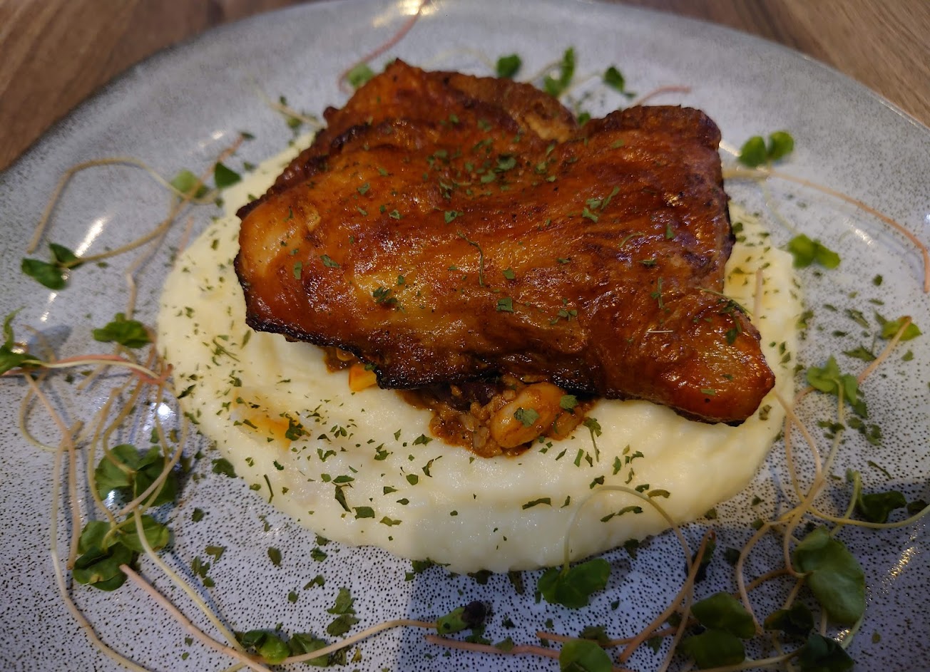 1.餐點吃起來真的蠻特別的,味道在中上,馬鈴薯泡泡吃起來綿密,不過價格較高,內容物感覺CP值不高。 2.同行友人有點甜點,看起來甜點應該是蠻推薦的,也很大塊。 3.服務生加水的時候噴濺出來在桌上,應該是沒注意到,但是連續兩杯都是如此,讓我很難不注意到。 服務 內用 餐點類型 晚餐 平均每人消費金額 $200-400 餐點:3 服務:3 氣氛:4