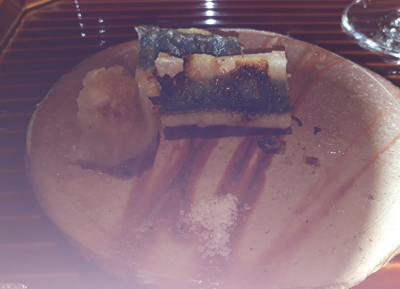 說說食物,簡單還不錯但不太有驚喜。最有爆點的是那個魚卷(有點忘記是什麼魚)酒漬的味道濕潤的口感確實特別,然後烤鰻魚皮烤得酥脆也是蠻不錯的。壽司的醋飯偏酸口,米飯粒粒分明,一入口中便能散開,除了魚肉外可以享受米粒的甘甜,確實不錯。食物唯一的缺點是,山葵味不出眾,我是有點想要山葵重口一點,幾道明顯放一坨山葵的味道都不是很重,也許對於不喜歡芥末嗆辣的人來說這是一種福音吧?