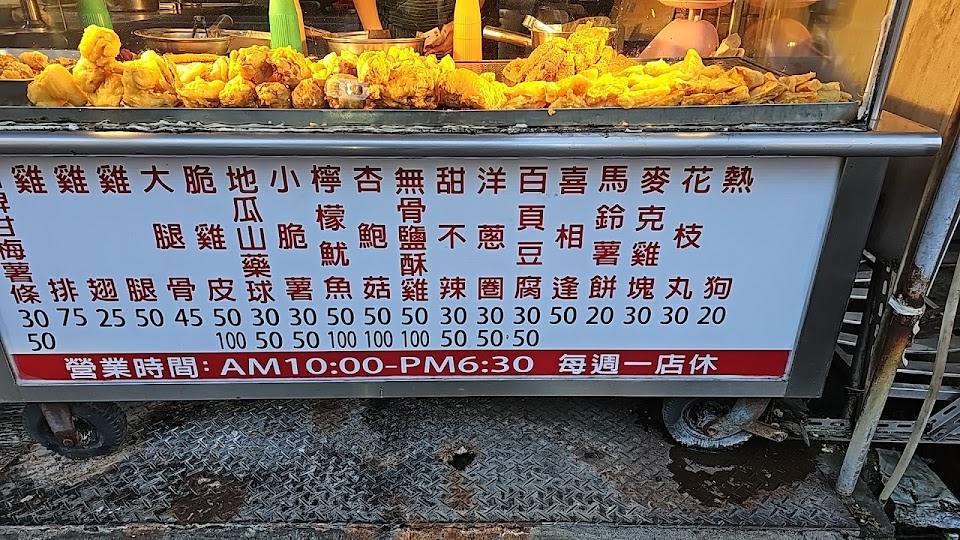 雞排不錯吃,現點現炸,通常都要稍等一下,每天中午開始營業到傍晚,賣完即打烊。週一休。