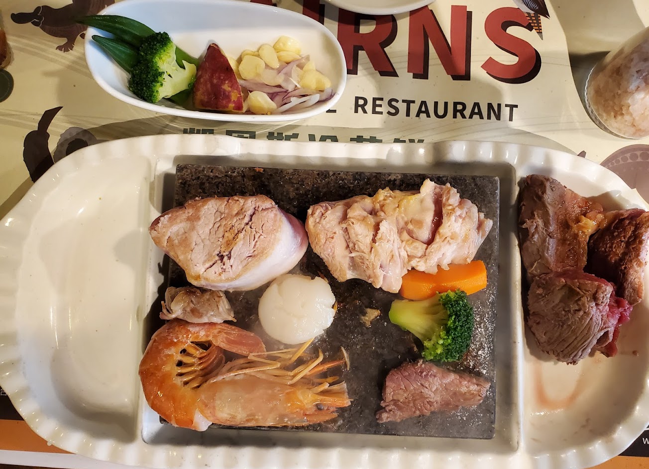 今天點了1790雙人餐 每道都不錯 最喜歡沙拉 特色是自己煎肉 可能吃太慢 後來石板沒那麼熱了 還請他們換石板 牛雞蝦都好吃 也喜歡他們是吃完主餐才上麵包和湯 十分正確! 不像以往在別的餐廳喝完湯已飽… 但吃完頭髮不免還是有燒烤味 然後自己煎肉十分有樂趣 但也比較累