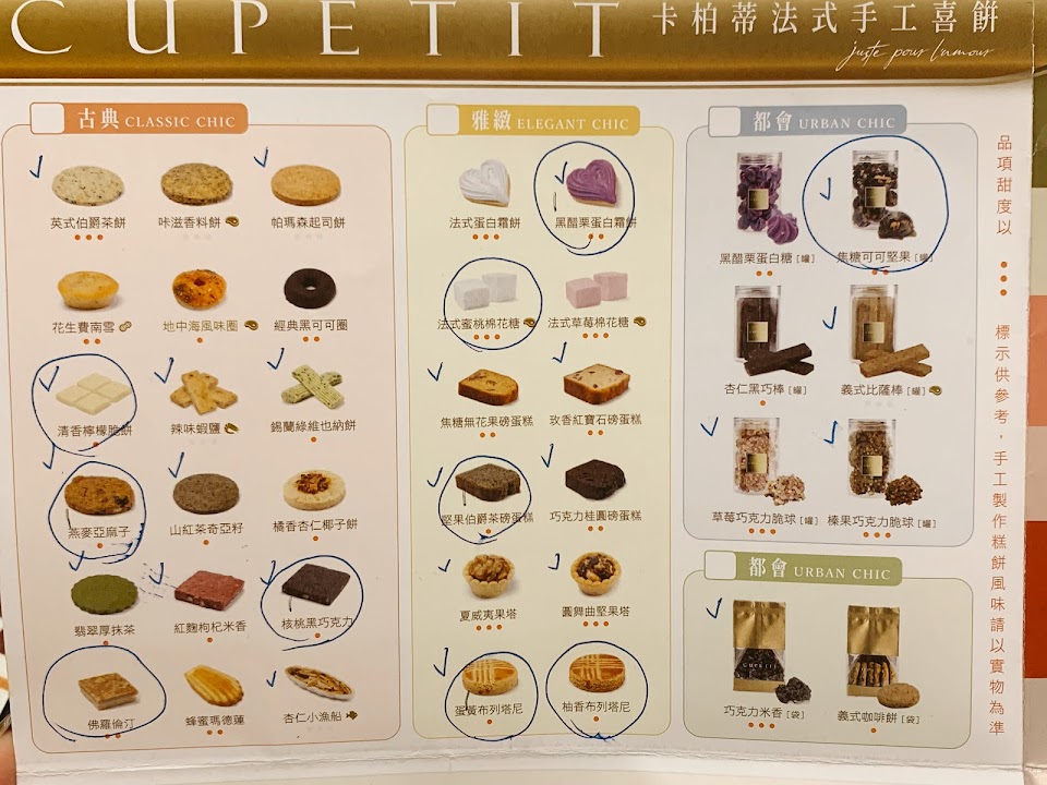 前一天臨時決定要去試吃 (而且不管男友要不要去,我都要去那種,哈哈! 完全被Erin的婚禮分享影片燒到!!!!!) 一直是以一盒$800來抓預算,也是這麼告訴Oly,她很清楚地就幫我們介紹了最符合預算的兩種盒裝組合,還很nice的讓我們多選了幾款猶豫不定的餅乾試吃,整個拯救了選擇困難症的我!! 試吃過程中,很清楚說明,也時不時會注意杯子裡的熱茶是否還有; 試吃後,協助試算幾種不同的方案,也很適時地離席讓我們有獨立討論的空間和時間,也不會催促 (好像是CUPETIT的員工SOP,哈哈,印象分數加好加滿啊) 好多餅乾、磅蛋糕一吃都很有驚豔的感覺,其中幾款更是一吃就立刻圈起來必選!!! 結果就是我們當天試吃完就下訂了XD,根本還沒去試吃另一位選手喜餅,哈哈哈哈!