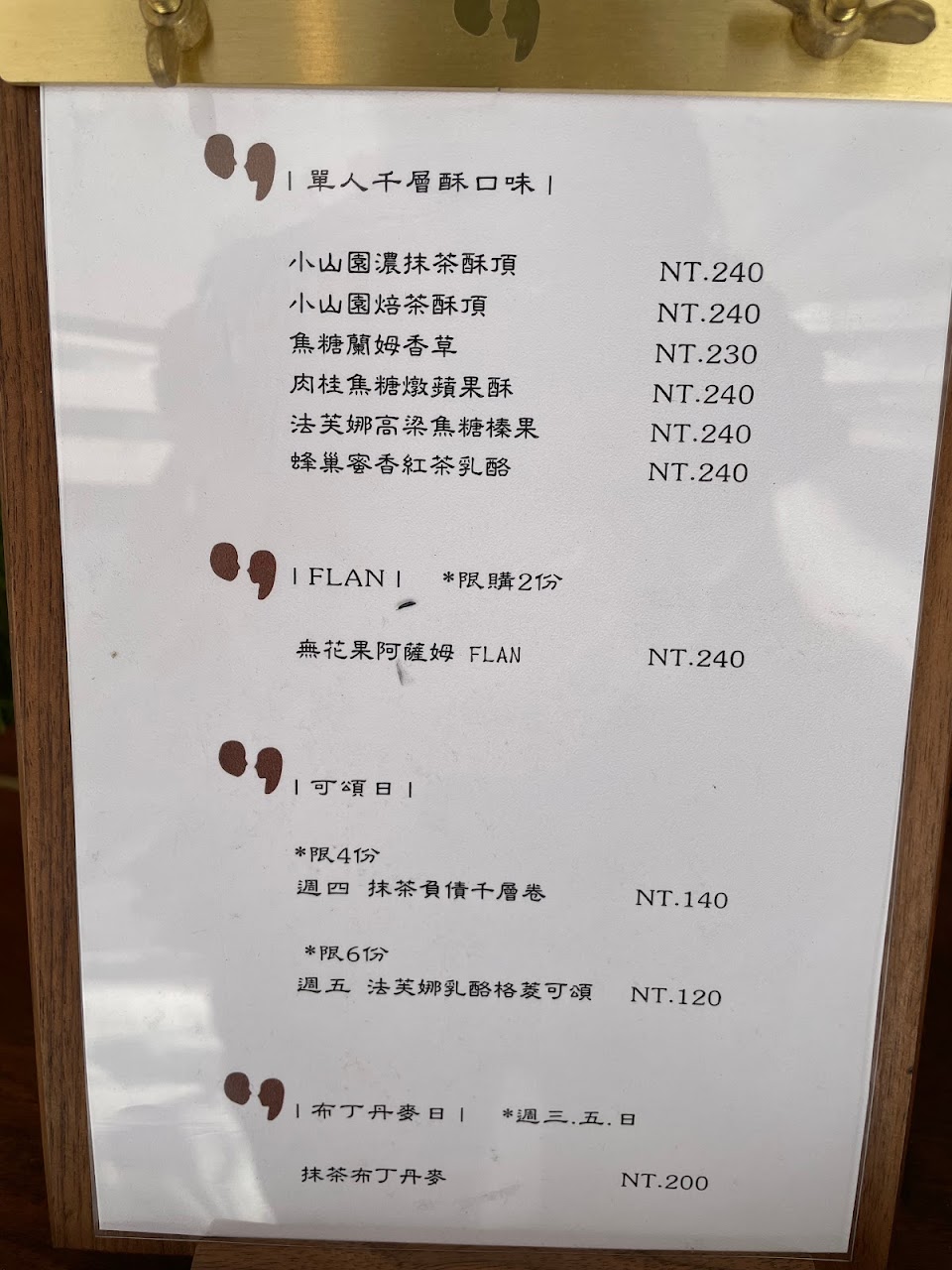 菜單是用手寫的,而且是用很像鉛筆的筆(不確定是什麼筆但是真的很淡)寫在咖啡色的紙上,可能店家想要給顧客手寫的溫度,但是真的很不方便進行閱讀,而且只有寫在甜點櫃前,所以在點餐前根本看不到到底當天有什麼品項,而點餐時會覺得後面有人在排隊沒辦法好好看過到底想要點什麼,只想迅速的完成點餐,整體的過程讓我感到很不舒服,讓我很疑惑這麼有名的店只能用這種形式呈現當天的品項嗎?