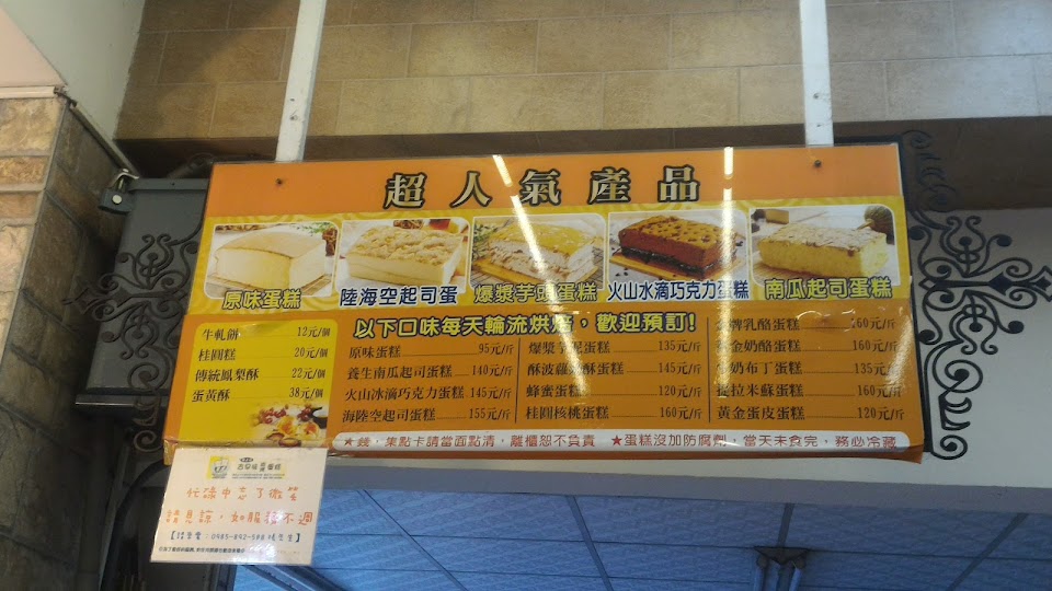2022最新價格及蛋黃酥明細表,豐原地區裡,我個人最喜歡的蛋糕店,蛋糕新鮮好吃是基本條件,難得的是服務態度極佳,價格更是優惠,年年都跟他訂蛋黃酥和月餅,料純味美,送禮誰說非名牌店不可?吃過的都驚艷應該給他九顆星的! 對了它的「桂圓蛋糕」長方形的,桂圓很香,核桃和葡萄乾料好多,重點是不甜膩,吃完嘴巴不會有膩的不舒服感,挑嘴的老公,只吃這一家的這一味!